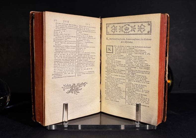 Illustré de jolis bandeaux et culs-de-lampe gravés sur bois. "Cet ouvrage, plus connut sous le nom de Dictionnaire de Poitiers, est dû à Charles Leroy, prote chez Faulcon, imprimeur à Poitiers. La première édition parut en 1739; et l'auteur mourut peut de temps après. Son dictionnaire a été réimprimé plusieurs fois, avec des corrections et de augmentations, et a été recherché pendant qu'il était le seul dictionnaire portatif de la langue française: l'édition la plus complète est celle de 1775, en un gros vol. in-8." Michaud, Biographies Universelles, vol. 37, p. 391.
