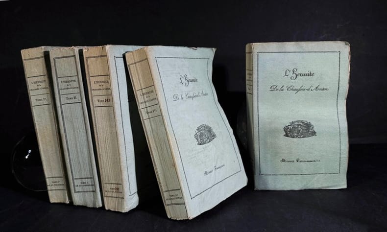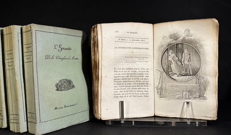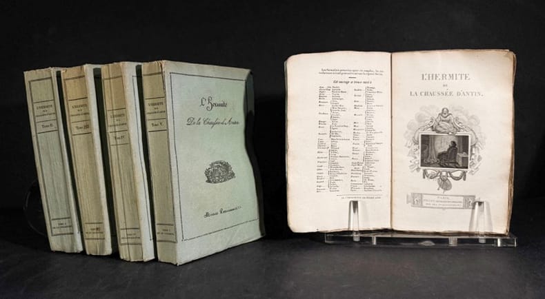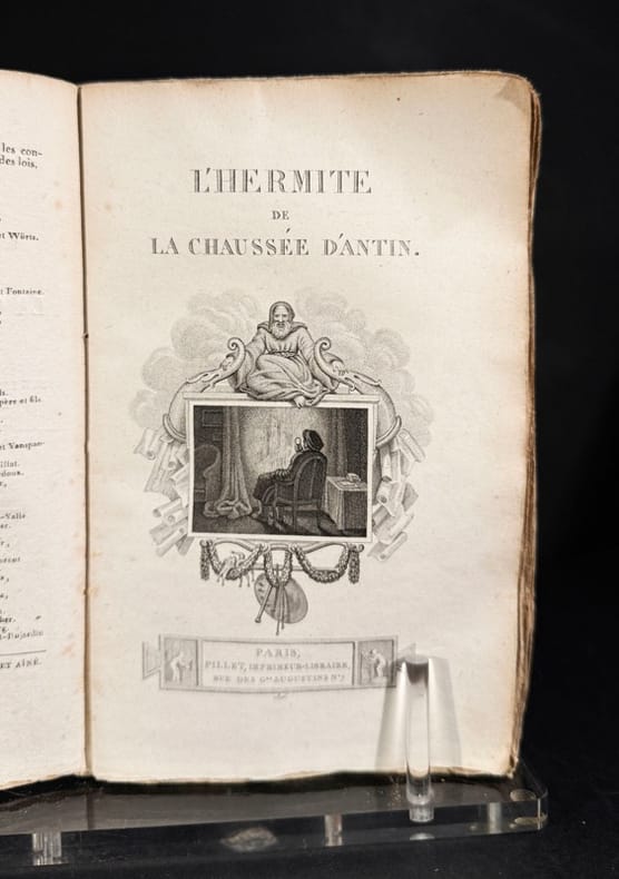 Exceptionnel exemplaire en brochure verte d’eau imprimée de l’époque, à l’état de neuf, portant en titre sur le plat supérieur « L’Hermite de la Chaussée-d’Antin, Mœurs Parisiennes » pour les quatre premiers volumes et Mœurs Françaises pour le cinquième. L’académicien de Jouy, dans de courts chapitres, brosse un paysage contrasté du Paris du début du XIXe siècle, écrit sur plus de dix années de 1811 à 1824 au fil de ses remarques et flâneries. Le quartier latin, carnaval et bal de l’opéra : Les bouquetières ; le Palais royal ; les Salons ; Les restaurateurs : la maison des fous ; Le marché aux fleurs ; Une vente apres décès ; Un duel ; Institution des sourds muets ; Modes et modèles ; La loterie ; Une maison d’éducation ; Une visite à l’hôpital ; Le balcon de l’opéra ; Un diner d’artistes. Le cinquième volume, contient une table analytique des matières traitées dans les cinq volumes.