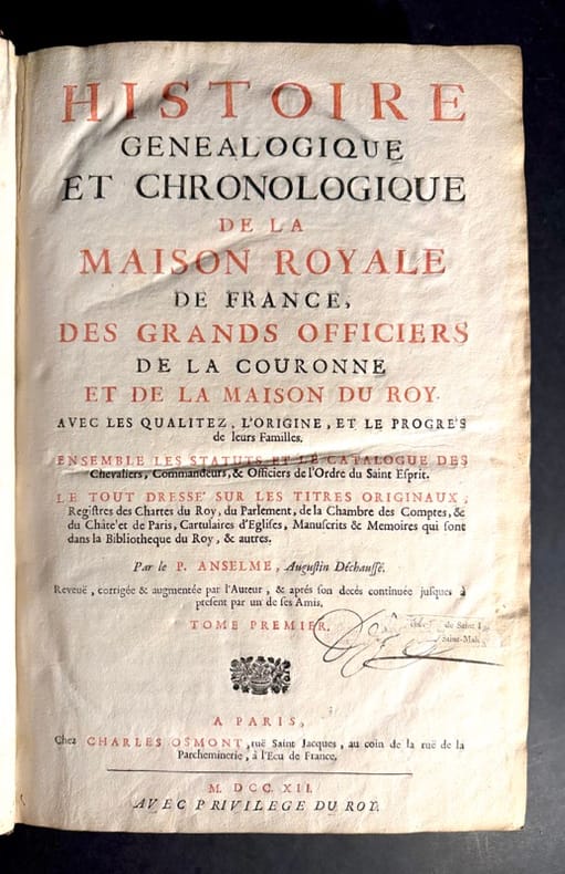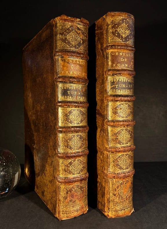 A Paris, Chez Charles Osmont, ruë Saint Jacques, au coin de la ruë de laParcheminerie, à l’Escu de France. 1712 TI : (9ff) ; 894 pp ; (19ff) ; (24ff) TII : (2ff) ; de 889 pp à 1786pp ; (15ff)2 volumes in folio en pleine basane d’époque dos à six nerfs ornés de fleurons, pièce de titre et de tomaison en maroquin quelques usures en coiffe mais solide exemplaire, Titre bicolore. Seconde édition de l’histoire généalogique du père Anselem , augmenté à son décès pas son amis et collaborateur Caille de Fourmy. Cette édition augmentée d’une importante table des matières et non citée est d’une maniabilité bien plus conséquente que la première édition publiée du vivant de l’auteur. Exemplaire en reliure de l’époque de ce grand classique