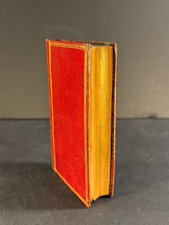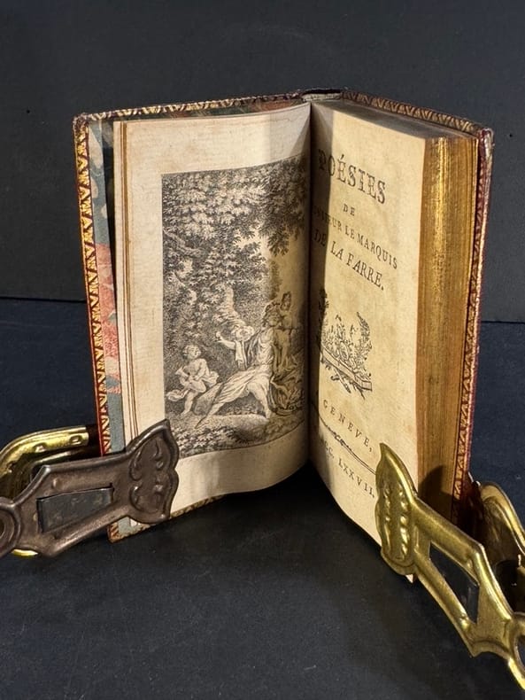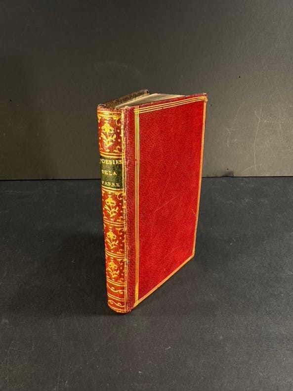 Genève Cazin 1777 Frontispice sculpté par Delaunay d’après Marié de 1780, plein maroquin rouge à grain long, dos plats ornés de fleurons, triple filet en encadrement, des plats pièce de titre de maroquin vert, reliure signée CazinCharles Philippe, marquis de La Farre (1644-1712) est un poète français dont la particularité réside dans son penchant pour la paresse. "Vers aisés par qui je m'assure moins de gloire que de plaisir / Coulés enfants de ma paresse..." Il a composé un livret d'opéra, des poésies et rédigés ses mémoires sur le règne de Louis XIV. Il a fréquenté de nombreux salons littéraires et fut nommé membre des Chevaliers de l'Ordre de la Mouche à Miel au château de Sceaux. Un ouvrage délicieusement inutile.
