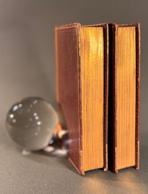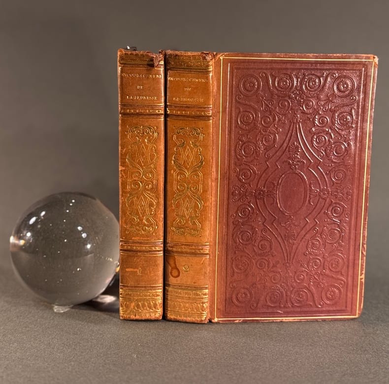 A paris chez Louis Janet, BLibraire, rue St Jacques, s.d. (circa) 1810 TI : faux titre, frontispice gravé, titre gravé sur cuivre, XIIpp, 374 pp, tables ; TII : faux titre, frontispice gravé, titre gravé sur cuivre, 374 pp, tables Deux volumes in12 reliés en plein veau glacé miel, dos à deux faux nerfs orné de filets et motif et frappé du titre et tomaison à l’or, plats orné d’un décor gaufré, encadrement de filet doré, tranches dorées. Intérieur frais, malgré des piqures parsemées, gravures encrées, coiffes usées, mors supérieur du tome second fendu sur qq centimiètres. Malgrés tout exemplaire agréable dans une belle reliure. Agréable exemplaire, dans une élégante reliure décorative du début du XIXᵉ siècle, de ce recueil moral et littéraire destiné à la jeunesse, illustrant diverses anecdotes autour de figures des lettres françaises (Florian, Delille, Bernardin de Saint-Pierre, Madame de Staël, etc.).