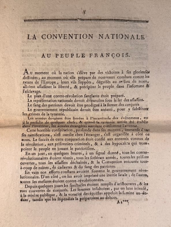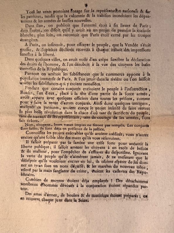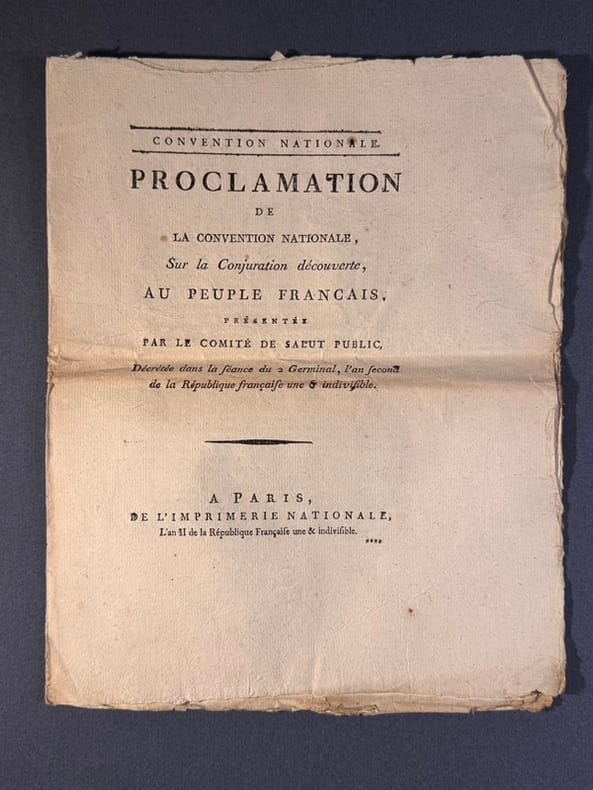 Paris Imprimerie Nationale 22 mars 1794 1er acte de Talien qui intègre le groupe des Indulgents. Il fait imprimer le II, cette proclamation une conjuration contre-révolutionnaire. Le 11 Germinal, les 6 députés dantonnistes sont accusés Talien donne la parole à Legendre qui n'arrivera pas à infléchir la volonté de Robespierre. Sa maîtresse Teresa est incarcérée le 12 prairial à la Force. Se sentant menacé, il sera à l'origine, avec Fouché, des événements du 9 termidor en coupant le discours de Saint Just et en empêchant Robespierre de prendre la parole. Robespierre est dénoncé comme tyran. Talien acquiert une dimension de héros et entre au Comité de Salut Public. A la suite de troubles qui sont la conséquence de la chute de Robespierre, Talien est dénoncé comme terroriste, mais par une habile volte-face sauve sa tête en l'échange de celle de Collot D'Herbois et Billaud-Varenne. Carrier et Lebon sont mis en accusation. Le 24 décembre 1794 le tribunal révolutionnaire est supprimé.En 1795, c'est le débarquement de Quiberon. Talien ordonne l'exécution de 727 prisonniers contrevenants à la parole de Hoche, qui leur avait assuré la vie sauve.