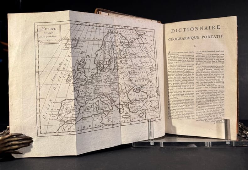 2 cartes dépliantes : "Mappe-monde divisée en ces quatre parties. 1795", "L'Europe divisée, en ses grands Etats. 1795". Note des abréviations. Dictionnaire géographique portatif. Table des noms latins. Système figuré de la Marine. Explication des termes de Marine.