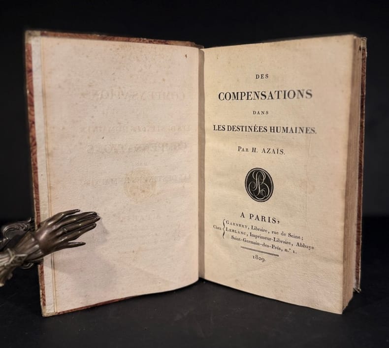 Protégé par Napoléon Ier, Pierre Hyacinthe Azaïs (1766-1845) développe un système philosophique basé sur la loi des compensations et de l'équilibre, ouvrant à l'harmonie universelle. L'ouvrage remportera un grand succès. Chassé de ses emplois à la Restauration, Azaïs obtiendra cependant une pension royale grâce à l'appui de ses amis, parmi lesquels Madame de Staël Complet en 3 tomes, (2eme partie, Tomes I & II, 1ière partie Tome III) ex libris vols, grand in-8, 210x140, reliés pleine basane époque, accrocs, manque de cuir, solidement relié, dos à nerfs, 257, 248, 335pp , complets, bon état intérieur, bien frais ouvrages rares. Paris de l'Imprimerie de Leblanc 1810