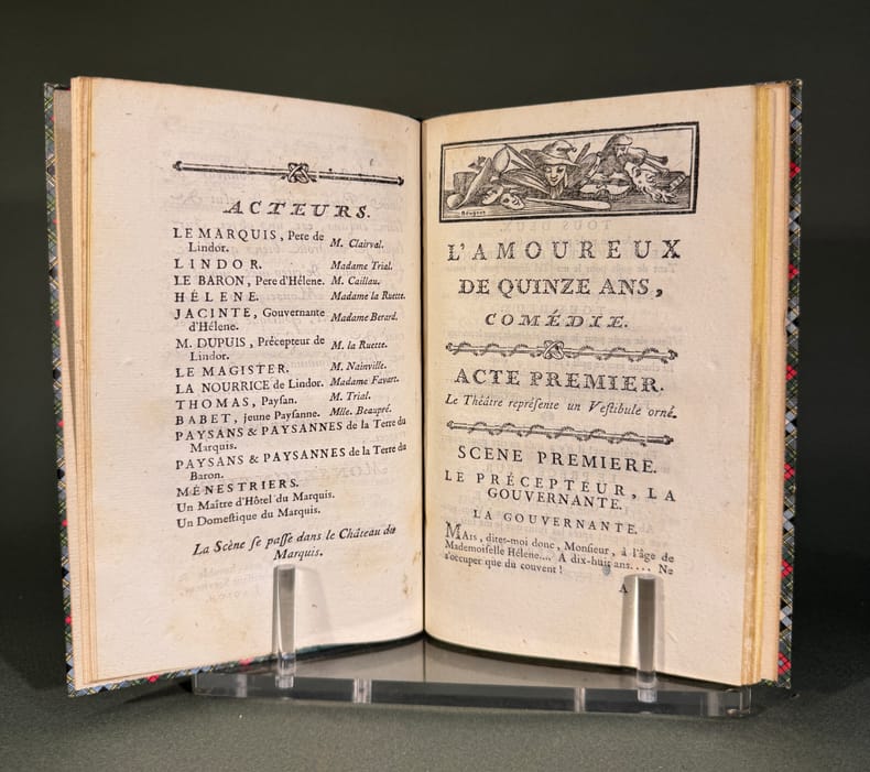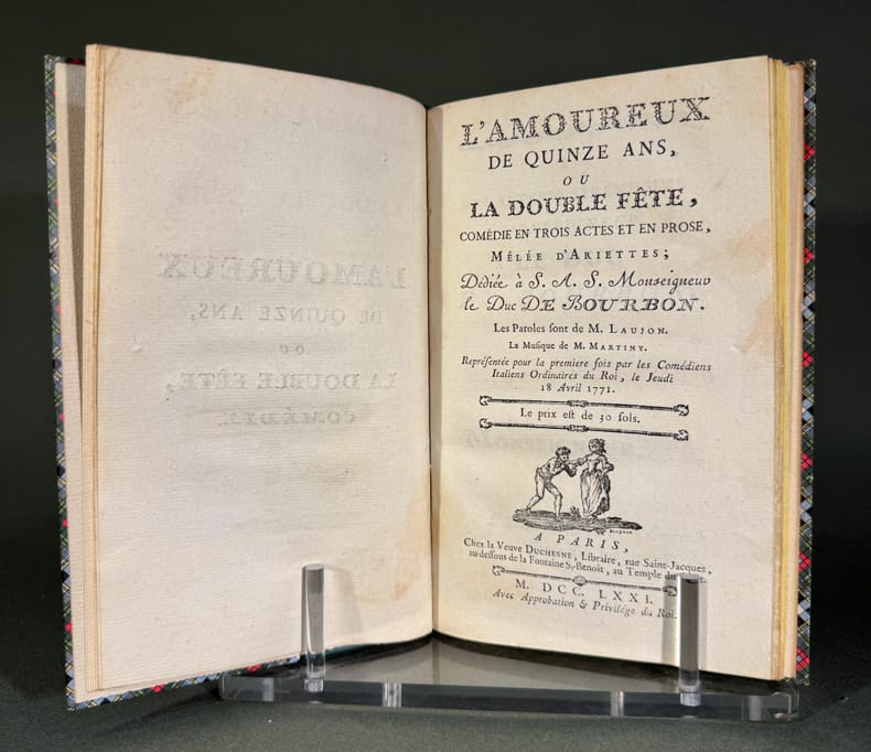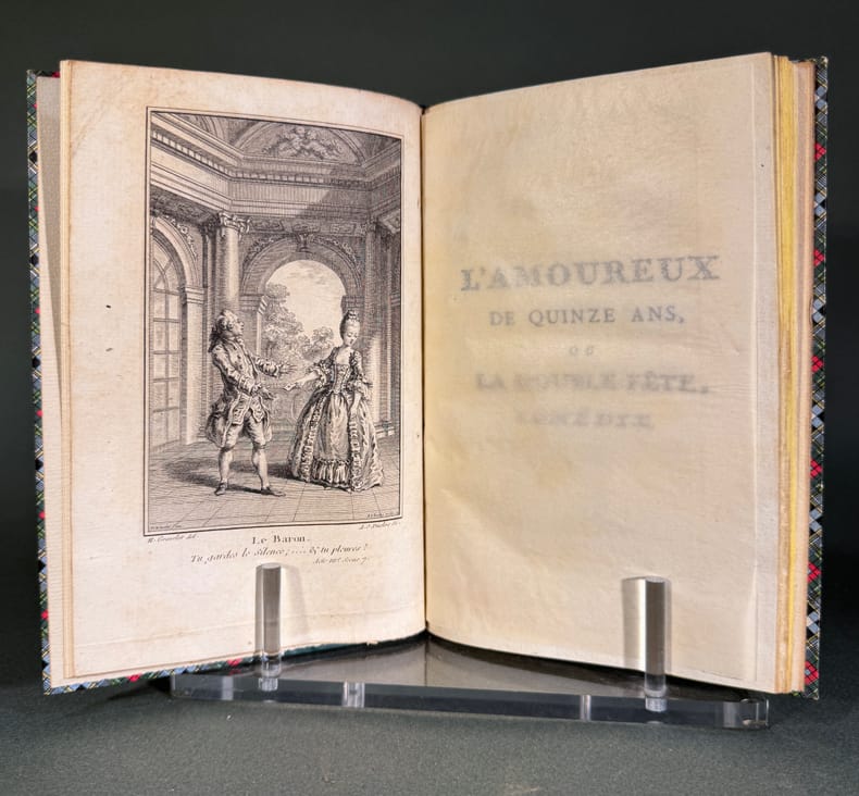 Paris, chez la veuve Duchesne, 1771. 1)In-8o, VIII, Frontispice de Gravelot, 88 p. 2) Chez Merlin 1770, 55 p. 3) V. DUCHESNE 1769, 71 p. 4) MERLIN 1769, p. 51, 5) VENTE, 1772, 60+VII p, 6) DIDOT 1771, 70 p., 7) DELALAIN, 1770, VII, Front. de Gravelot, 86+VIII. En tetes, vignettes xylographies, cahiers de chansons (Ariettes) SOIT 7 PIECES surtout en EDITION ORIGINALE. Rel. 1/2 veau contemp., dos droit orne, coiffes abimees et un mors faible.