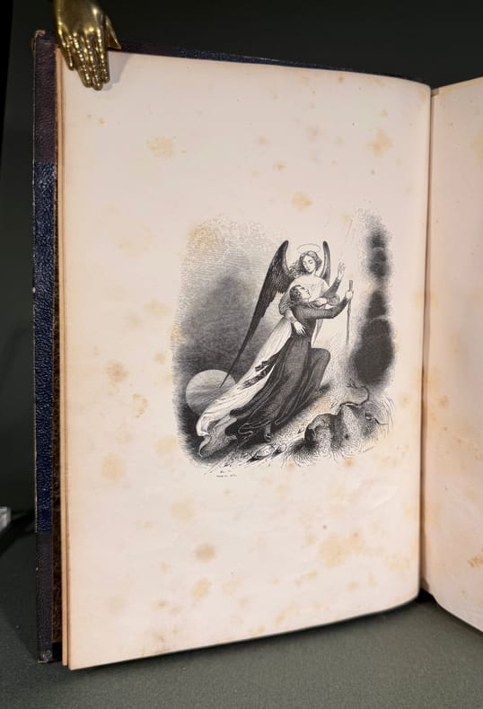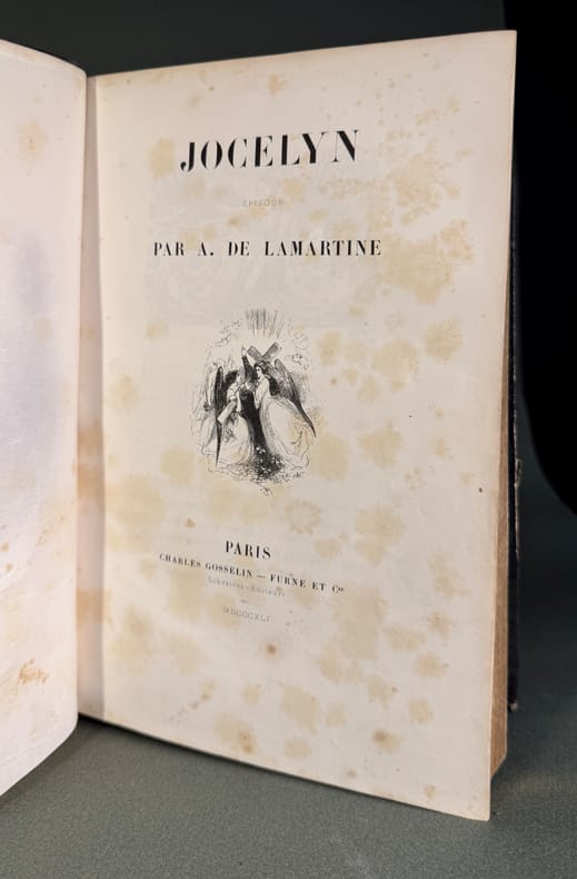 Première édition illustrée et premier tirage, dite édition "Keepsake", en partie originale, comportant 12 planches (frontispice compris) hors texte d'après Marckl, gravées sur bois par Quartley, Dujardin, Herbert, Piaud et Timms, vignettes sur bois dans le texte, et 10 titres-frontispices compris dans la pagination (Carteret III, p. 366 ; Vicaire, IV, 976-77; Talvart XI, 19E) — L'édition originale (non illustrée) date de 1836. – Jocelyn, poème de Lamartine, est le journal et la confession d'un prêtre. Jocelyn est entré au séminaire afin de pouvoir abandonner à sa soeur sa part d'héritage et lui permettre d'épouser l'homme qu'elle aime. Les événements de 1793 l'obligent à se réfugier dans une grotte solitaire des Alpes. Un émigré, poursuivi par les soldats, meurt dans la montagne en confiant à Jocelyn son fils Laurence. Les deux jeunes gens vivent dans les bois, pleins de santé et de bonheur, attirés l'un vers l'autre par de vagues désirs. Enfin, Jocelyn découvre que Laurence est une femme, et une femme qui l'aime tendrement. Un jour, Jocelyn est appelé auprès de son évêque, prisonnier et mourant. Le vieillard lui confère les ordres, afin de pouvoir se confesser à lui. Une soeur de charité va annoncer à Laurence le sacrifice de Jocelyn. Deux années se passent. Jocelyn est devenu curé de Valneige. Après avoir longtemps souffert, il a conquis la paix du coeur. Laurence, pour s'étourdir, s'est jetée dans les plaisirs du monde. Quelques années après, elle vient mourir dans la montagne où elle a vécu heureuse, et c'est Jocelyn qui reçoit sa confession. L'amour, à la fois ardent et chaste, des deux jeunes gens, la grandeur du sacrifice chez Jocelyn, la sérénité où son âme arrive à la fin, les descriptions de la nature amples et abondantes, une pensée philosophique élevée côtoyant parfois une poésie intime et familière, des épisodes de toute beauté comme ceux des Laboureurs, de I'ordination de Jocelyn, des funérailles de Laurence, tels sont les principaux mérites de cette oeuvre. (Imago Mundi)