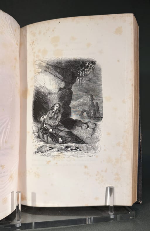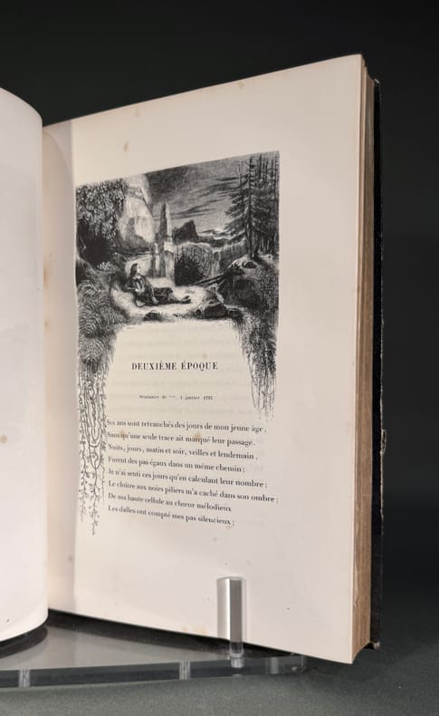 P., Charles Gosselin, Furne et cie, 1841, pt in-4°, (4)-xl-424 pp, introduction par Jules Janin et nouvelle préface de Lamartine, un frontispice et 11 gravures hors texte sous serpentes roses légendées, nombreuses vignettes dans le texte, reliure plein chagrin bordeaux, dos à 4 nerfs filetés soulignés à froid, caissons à froid à décor doré, titres dorés, décor doré et filets à froid d'encadrement sur les plats, coupes filetées, dentelles intérieures dorées, gardes de papier moiré, tranches dorées (rel. de l'époque), bon état. Très bon exemplaire sans rousseurs