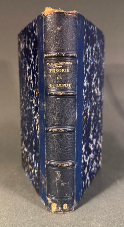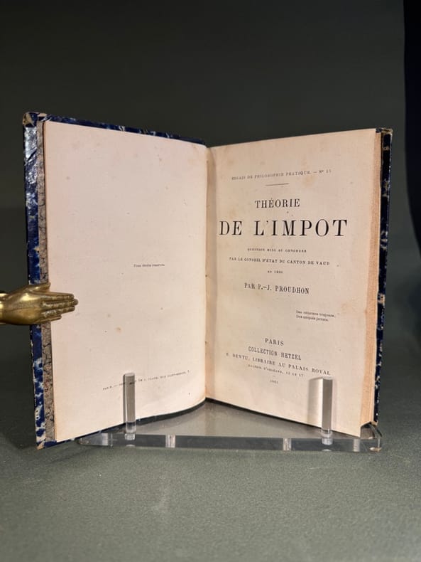 Bruxelles: Office de Publicité, 1861 in-8, iv-315 pages. Demi reliure toile verte, très bon état. En 1860, Proudhon, alors en exil à Bruxelles, apprend que le conseil d'Etat du canton de Vaud met au concours la question de l'impôt et décide de rédiger un mémoire. Ce travail, pour lequel il obtient le premier prix, sera publié l'année suivante sous le titre «Théorie de l'impôt». Edition originale.