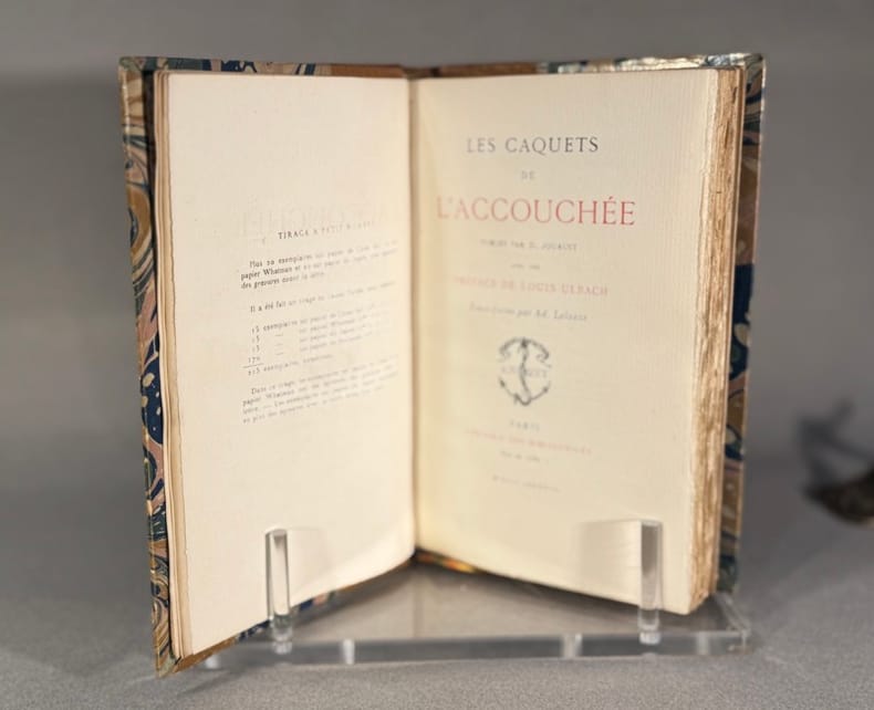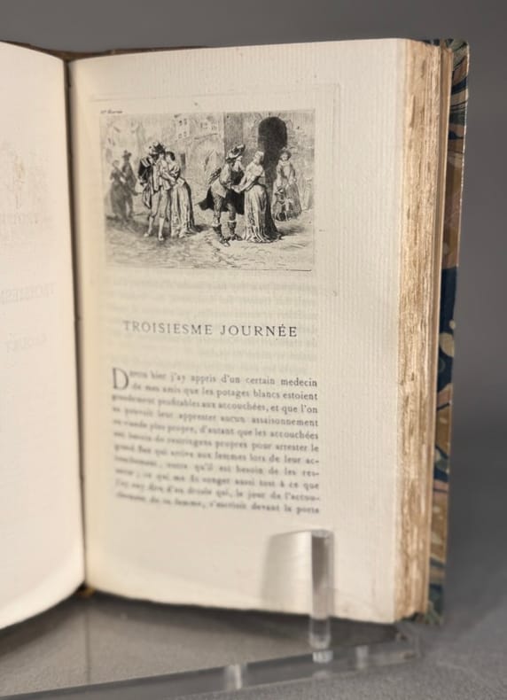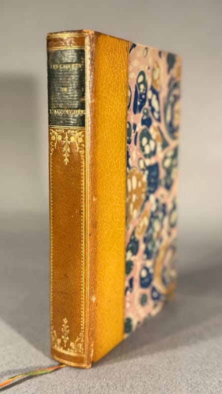 In-8 (220x145mm) maroquin havane, sur les plats large encadrement de filets or droits et en pointillés, motif d'angle à petits fers, dos à nerfs orné de même, filets or sur les coupes,doublures de maroquin vert jade serties or, gardes de tabis de même couleur, tranches dorées. Etui. Reliure signée d'Huser. "Les Caquets de l'accouchée' dépeignent la vie bourgeoise au XVIIème siècle et furent publiés annonymement en 1622. PREMIER TIRAGE des délicates et délicieuses eaux-fortes de Ad. Lalauze. UN DES 15 PREMIERS EXEMPLAIRES sur Japon impérial (tirage identique sur Chine et Whatman), comportant un tirage à part sur Japon des gravures."