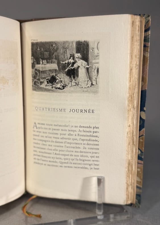 Paris, Librairie des Bibliophiles, 1888, Plein parchemin orné d'une fine composition en couleurs dessinée à la main. Tête dorée. Couvertures conservées présentant quelques piqûres., 226 pages. Bel exemplaire. Ouvrage orné de 8 gravures et de 6 culs-de-lampe. Ex-libris. Reliure de Dode.