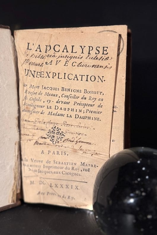 Paris, Chez la Veuve de Sebastien Marbre-Cramoisy, Imprimeur du Roy, rüe Saint-Jacques, aux Cigognes, M.DC.LXXXIX [1689], 1 vol. in-octavo (19,7 x 12,8 cm). Complément au titre : Par Messire Jacques Benigne Bossuet, évesque de Meaux, Conseiller du Roy en ses conseils, cy-devant Précepteur de Monseigneur le Dauphin ; Premier Aumosnier de Madame la Dauphine. L'ouvrage se compose de : 1 f. blanc, 1 f. de titre, p. 3-96 : préface, p. 1-496 : L'Apocalypse ou révélation de Saint Jean apostre, en 22 chapitres, 16 f. : Abrégé de l'Apocalypse, p. 497-732 : Avertissement aux protestans sur leur prétendu accomplissement des Prophéties, p. 733-838 : Récapitulation, Éclaircissement et Confirmation de toutes nos preuves, et de tout cet Ouvrage sur l'Apocalypse, 15 f. de table des matières contenües tant dans la préface que de l'explication de l'Apocalypse, & de l'avertissement, 1 f. d'extrait de privilège du Roi, 1 f. blanc. Texte sur 1 colonne ; 2, pour la table des matières. Très élégant travail typographique servi par de belles marges. Le feuillet d'extrait du privilège du Roi indique un 'achevé d'imprimer pour la première fois ... le 7 may 1689'. Édition originale, conforme au descriptif détaillé donné par Tchemerzine. Marque d'imprimeur 'Aux cigognes' en page de titre et bandeau au burin en p. 97. Jacques Benigne Bossuet (1627-1704) : formé à la religion et aux humanités, il est théologien, orateur et historien. Évêque de Condom puis de Meaux. Précepteur du Grand Dauphin. Veuve de Sébastien Marbre-Cramoisy [Françoise Loir] (16..-1717) : Imprimeur du Roi, libraire. Directrice de l'imprimerie royale du Louvre (jusqu'en 1691). Fille d'un orfèvre parisien. Épouse Sébastien Marbre-Cramoisy en 1670. Elle lui succède en juin 1687. Son officine est déclarée sans activité en 1697 puis liquidée en 1698. Jean-Joseph Barbou rachète son fonds et sa maison en 1715.