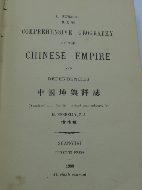 Shanghai, T'usewei Press, 1908. 1 volume, 8vo, 713 pp, hard cloth boards, illustrated with 42 black and white maps, figures and illustrations, without the 4 color folding maps, a very good copy.
