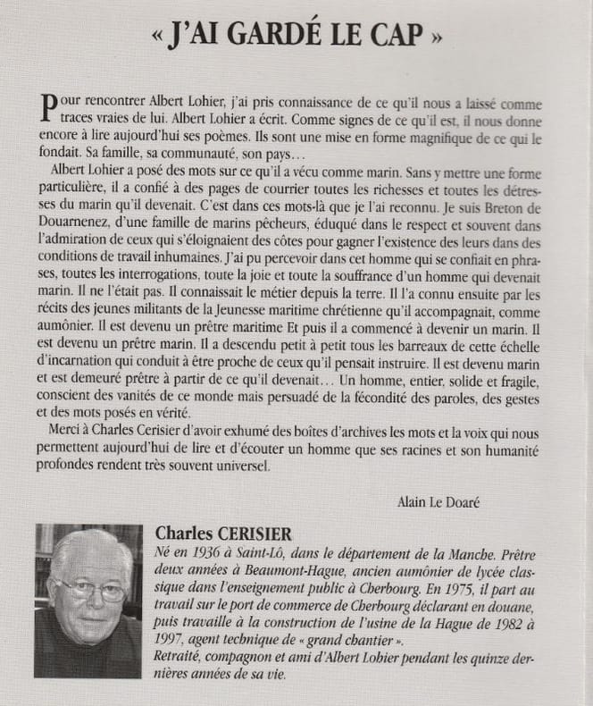 Né en 1915, à Urville , dans le hameau Capel, enfant d'une modeste famille de pêcheurs Albert Lohier manifeste très tôt son volonté de devenir prêtre, après le séminaire et son ordination, il est aumônier de la JOC pendant l'occupation, à la Libération il embarque comme marin pécheur pour la mission de la mer, dix ans plus tard il sera contraint de mettre sac à terre, le Vatican ayant mit fin à l'expérience des prêtres ouvriers. Cette vie active ne l'empêchera pas de compter parmi les poètes les plus inspirés de la langue normande, ( le parler cotentinois), Il est l'auteur de Raz-Bannes, Les Côtis, Graund Câté...