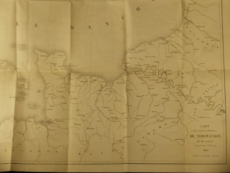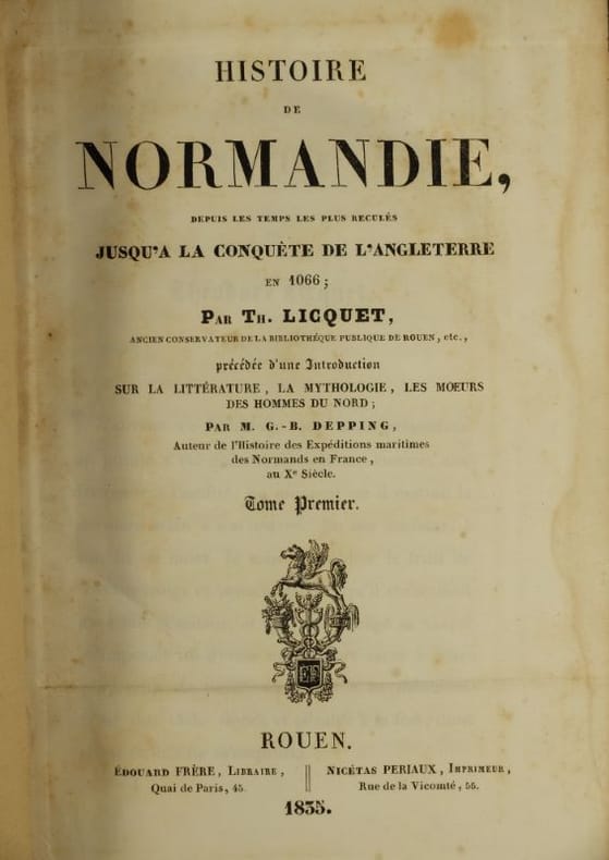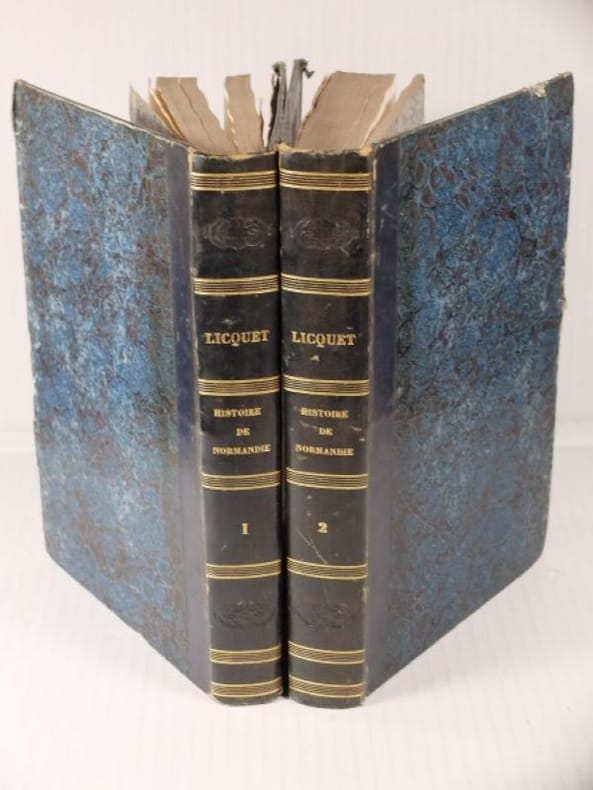 " En tête du premier Volume se trouve une Notice sur Théodore Licquet par M.Deville, et à la fin du Tome II un long extrait de Benoit de Sainte-More relatif à la Bataille d'Hastings. Théodore Licquet a succombé à une longue maladie avant d'avoir mis la dernière main à ce grand Ouvrage pour l'achèvement duquel les Editeurs secondés par Deville, ont eu recours aux profondes connaissances de M.Depping sur l'Histoire des Scandinaves."Frère,Bibliographe Normand, T.II, 251.