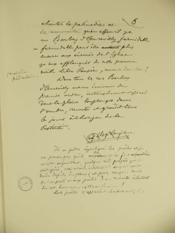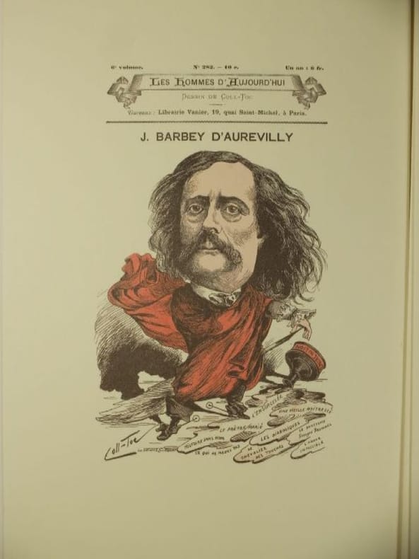 "Barbey n'a jamais eu pour Verlaine, on le sait, la sympathiequ'il éprouvait pour Baudelaire dont il admirait "Les Fleurs du Mal"et qu'il défendit lors du procès de 1857."