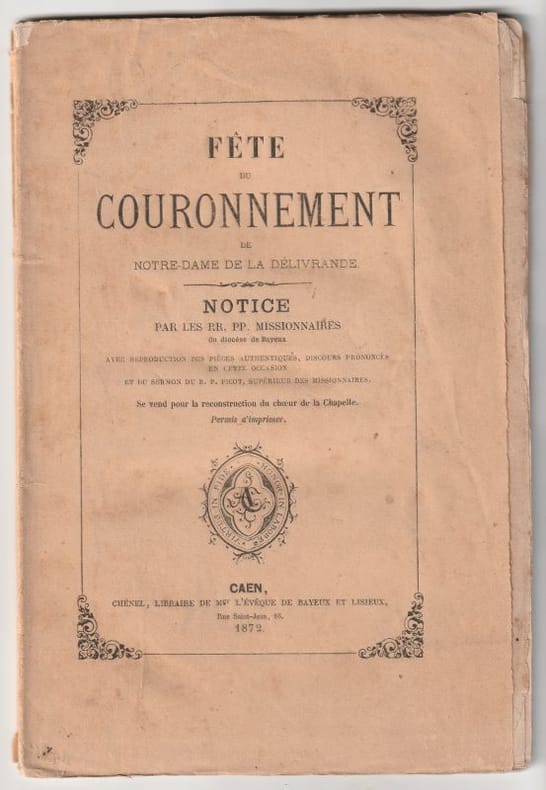 1872 Notice par les Révérends Pères Missionnaires du Diocèse de Bayeux, Caen, Chénel, Libraire, 1872,1 Volume broché, 232 x 160 mm. 62 pp.Tampon de la Bibliothèque des Missionnaires de La Délivrande, en page de titre.modestes usures d'usage.