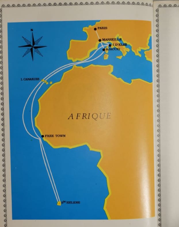 Trajet de la Croisière sur le Paquebot "France" Paris, Marseille, Île d'Elbe, Ajaccio, Canaries, Free Town, Sainte-Hélène, et retour.