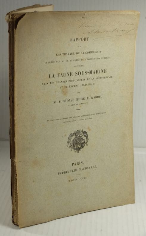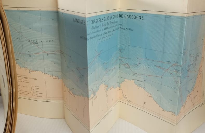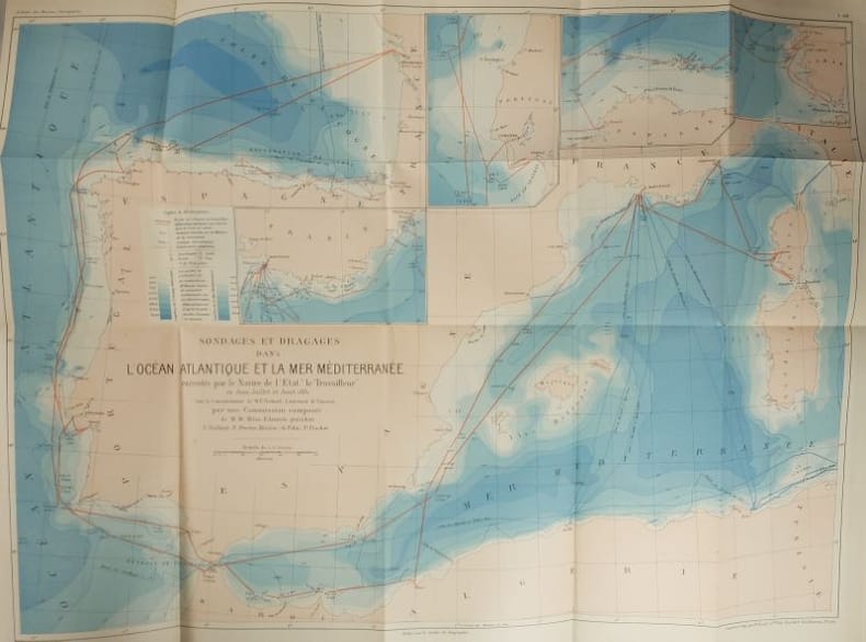 1882 Paris, Imprimerie Nationale, 1882, 1 Volume broché, 248 x 160 mm. 63 pp. Complet des 2 Cartes dépliantes des Sondages et Dragages dans l'Océan Atlantique et la Méditerranée, et dans le Golfe de Gascogne effectués à bord du "Travailleur". modestes usures d'usage.