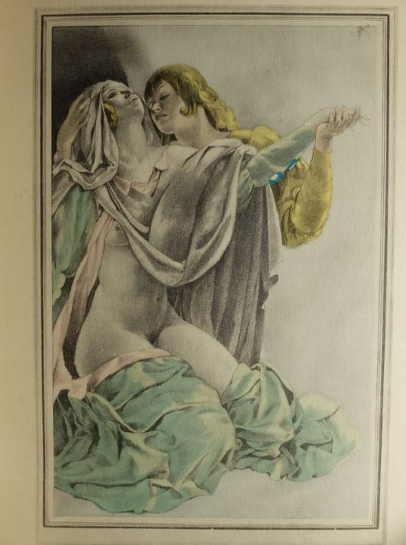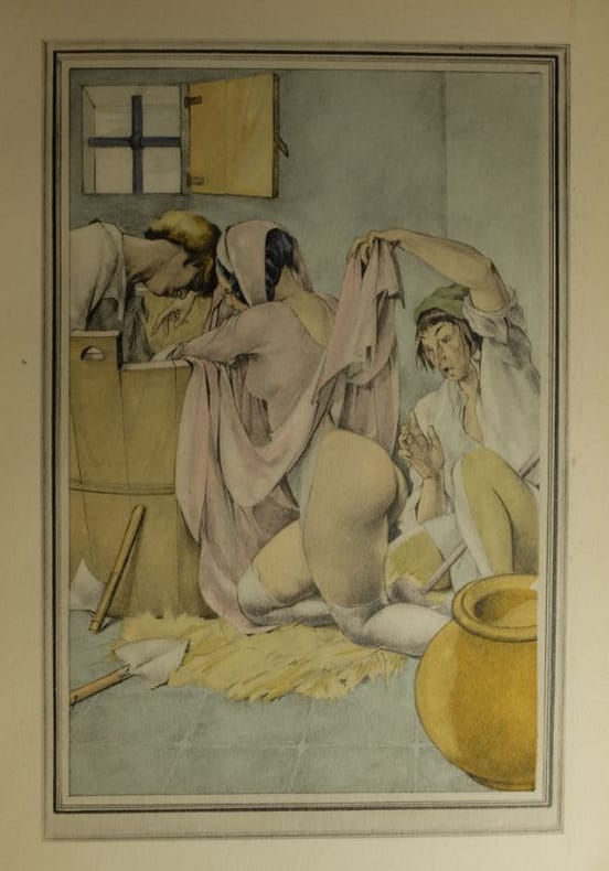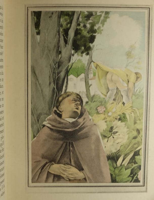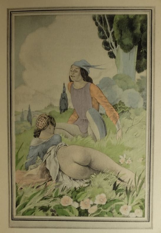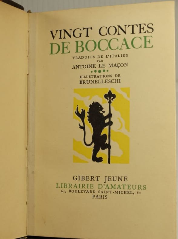 1940 Traduit de l'italien par Antoine Le Maçon, Illustrations de Brunelleschi, Paris, Gibert Jeune, Librairie d'Amateurs, 1940,1 Volume relié, 205 x 140 mm. 165 pp. Reliure demi cuir, dos à nerfs, caissons fleuris, Tranches mouchetées, Ouvrage orné de 16 Gravures en couleurs, hors texte, et 19 Dessins en noir, Exemplaire numéroté, sur vélin de Navarre. Bel exemplaire.