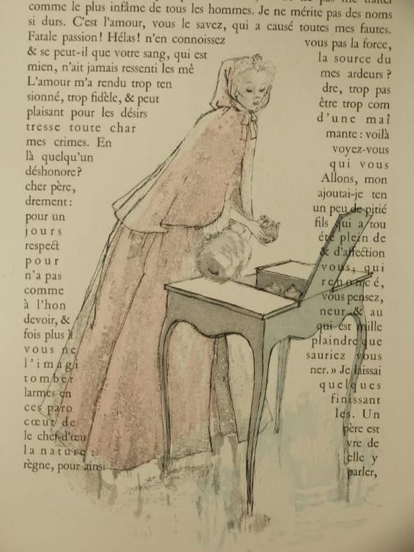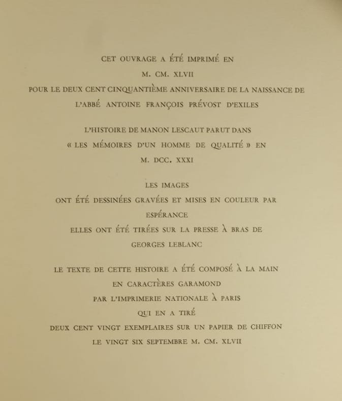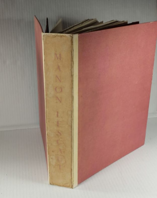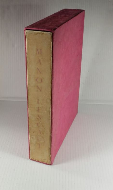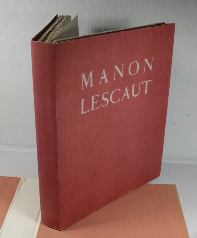 1947 Paris, Edition du Pas de la Mule, 1947,1 Volume sous coffret, 297 x 237 mm. 177 pp. Ouvrage en feuilles sous couverture rempliée et chemise carton titre en long, le tout protégé par un étui carton de couleur assortie. Illustrations couleurs dans le texte et sous serpente de Espérance.modestes usures d'usage au dos de la chemise carton, du reste, bonne condition.Histoire du Chevalier des Grieux et de Manon Lescaut,