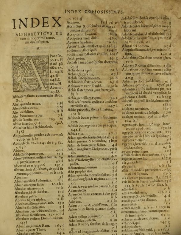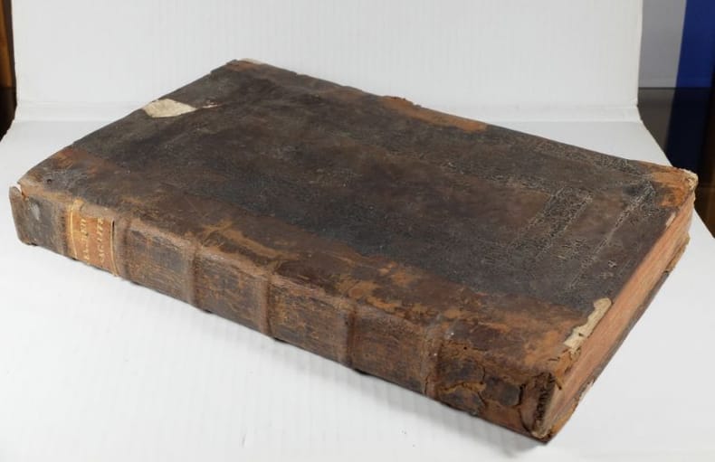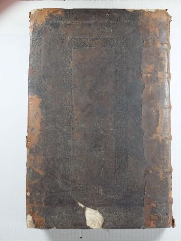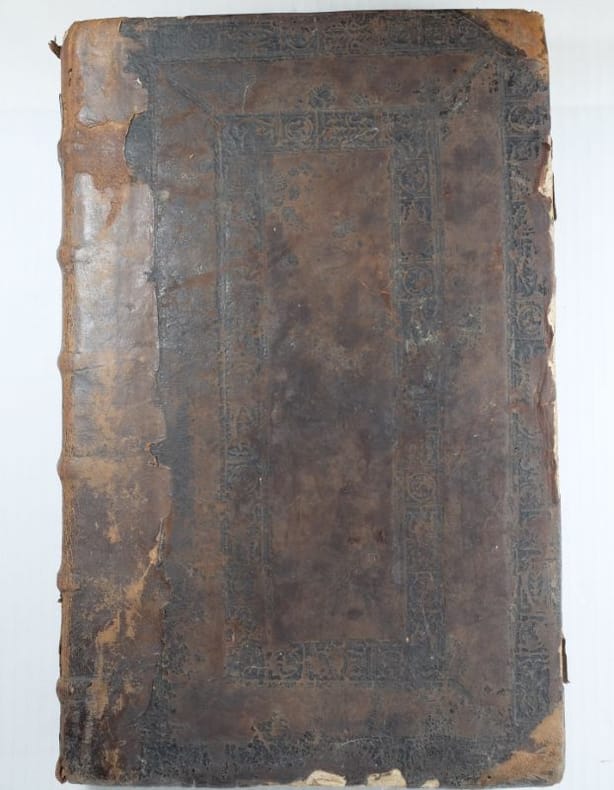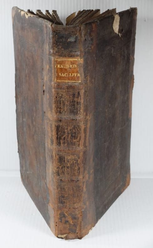 1545 Paris, chez Pierre Regnault, rue Saint-Jacques, 1545,1 Volume relié, 340 x 220 mm. 267 pp, sur 272 pp. annoncées, dos à 6 nerfs, pièce de titre, quelques commentaires marginaux, à la plume,usures d'usage, reliure "restaurée" plats d'origine avec son décor à froid, dos cuir, époque postérieure,épidermure et manques de cuir, traces de brûlure sur 2 pages avec manque de lettresCommentaires en latin des Livres de la Bible : Genèse, Exode, Lévitique,Les Nombres, Deutéronome, Samuel, Ezram, Néhémie, Tobie, Job, Salomon, Cantique des Cantiques,Exode, 24.12 - 30.21,Instructions sur les Objets sacrés du Culte et les Vêtements sacerdotaux,