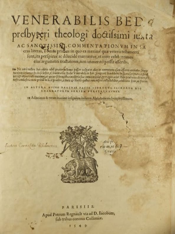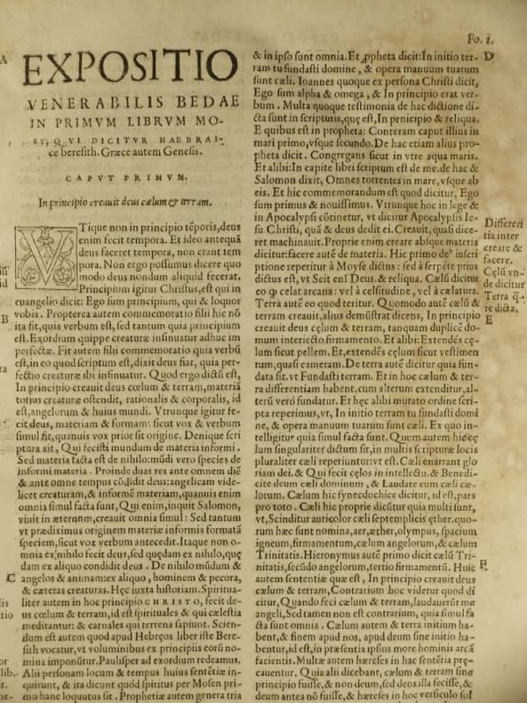 Premier tome des commentaires sur les Saintes Écritures du vénérable Bède, prêtre, théologien très savant et tout aussi saint : dans lequel sont exposées avec clarté et précision principalement les parties de l’Ancien Testament, de telle manière qu’il peut à juste titre être compté parmi les plus célèbres auteurs traitant de ce sujet.Mais pour que notre édition ne soit pas considérée comme ne faisant que reproduire ce qui a déjà été largement diffusé jusqu’à présent, nous voulons t’en avertir, lecteur studieux : les commentaires du Vénérable Bède sur Job (auteur sans doute d’une extrême difficulté et obscurité dans l’Écriture Sainte, lui qui dissimule tous ses mystères sous des figures et s’exprime presque entièrement dans un style tragique) paraissent ici pour la première fois grâce à notre travail, délivrés des vers et des moisissures contre lesquels ils luttaient misérablement. Acquiers-les et réjouis-t’en."Bède, dit le Vénérable, moine et lettré anglo-saxon né vers 672 en Northumbrie et mort le 26 mai 735. Son œuvre la plus célèbre, l'Histoire ecclésiastique du peuple anglais, lui a valu le surnom de Père de l'histoire anglaise"