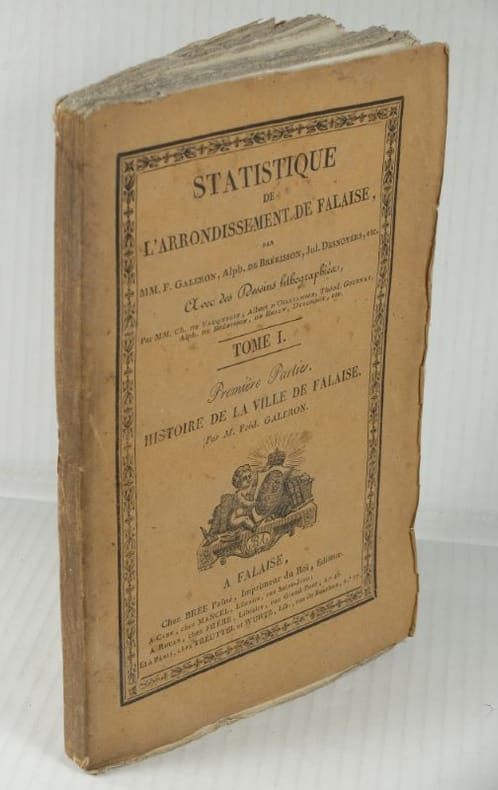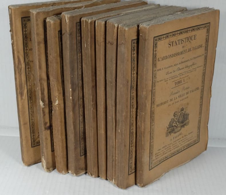 1826 Falaise, Caen, Rouen, chez Brée, Mancel, Frère, 1826-1839,9 Volumes brochés, 215 x 140 mm. pagination continue,Tome I, Première Partie, Histoire de la Ville de Falaise,Tome I, Deuxième Cahier, Fin de l'Histoire de Falaise et description de la même Ville,Tome I, Troisième Cahier, Description de la Ville de Falaise,Tome II, Quatrième Cahier, Description des 2 Cantons de Falaise,Tome II, Cinquième Cahier, Suite de la Description de la Ville de Falaise, Tome II, Sixième cahier, Description du Canton de Couliboeuf, Tome III, Septième Cahier, Description du Canton de Bretteville-sur-Laize,Tome III, Huitième Cahier, Canton de Bretteville-sur-Laize,Tome III, Neuvième Cahier, Fin du Canton de Bretteville-sur-Laize etcommencement de celui de Thury-Harcourt,