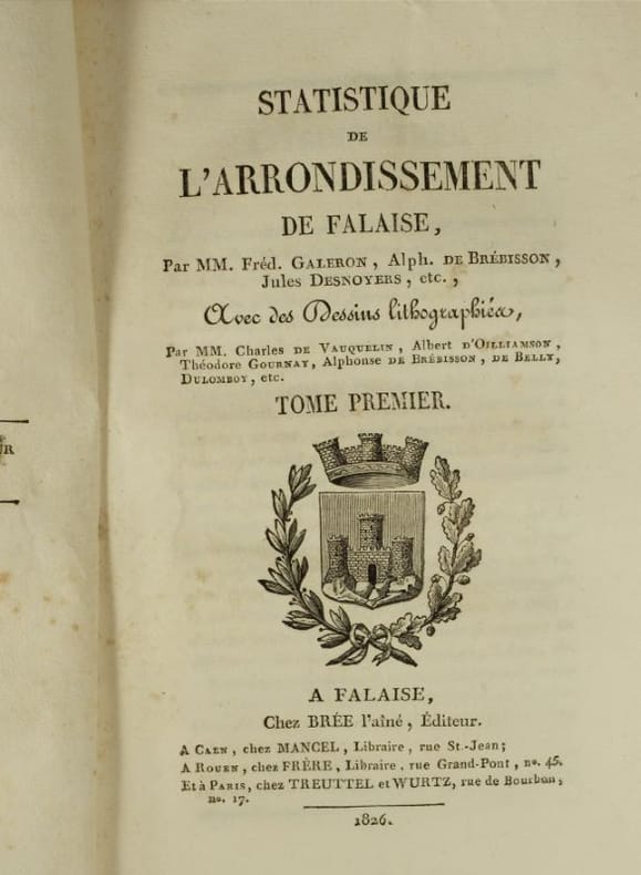 "Cette oeuvre monumentale a connu quelques changements, prévue initialement en 8 parties, puis 12, interrompue par la mort de son auteur, en 1839, elle sera compétée et terminée quelques temps plus tard par Alphonse de Brébisson, son principal collaborateur, qui reprendra toutes ses notes et travaux préparatoires."Notice biographique sur Frédéric Galeron, Julien Travers, Falaise, Levavasseur, 1840,Frère, bibliographe normand, II, 6,Concernant les Dessins lithographiés annoncés, exécutés par messieurs Charles de Vauquelin, Albert d'Oilliamson, Alphonse de Brébisson, de Belly, Dulomboy.Ils devaient être rassemblés dans un Atlas contenant 40 Lithographies,en vérité, quelques unes, seulement, ont été distribuées et reliées en Albums par des Amateurs éclairés, si bien que cet ouvrage, d'une insigne rareté, donne à penser à quelques Bibliographes qu'il n'existait pas , la BNF ne le possède pas, le CCFR le signale dans une Bibliothèque municipale de l'Orne ! Aucune Gravure ne fut insérée dans les Cahiers parus en livraison, aucune également dans la version définitive en 3 Volumes.