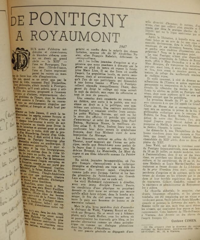 "Après avoir acquis en 1906 l'ancienne abbaye cistercienne de Pontigny, Paul Desjardins décida quatre ans plus tard d'y organiser chaque été des "rencontres" de dix jours, devenues assez vite célèbres sous le nom de "Décades.
