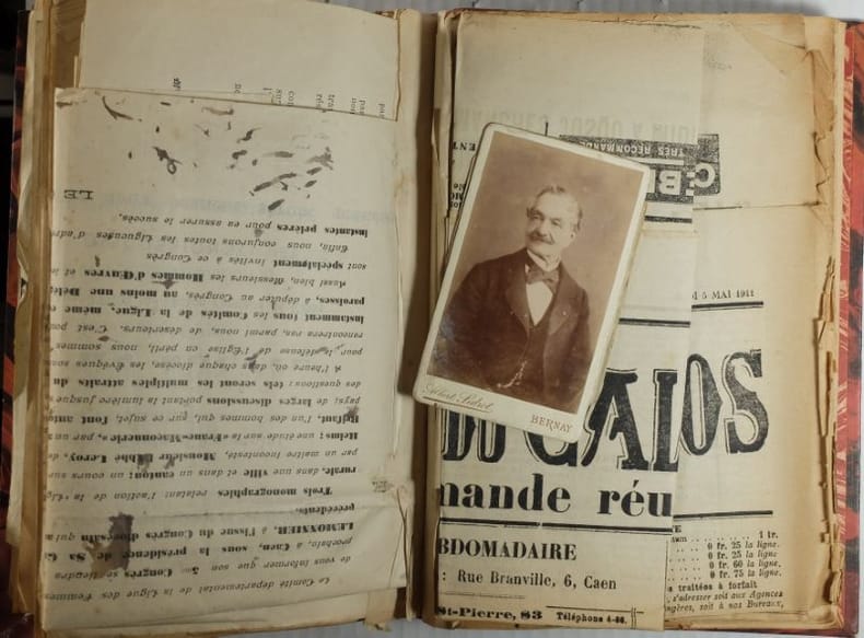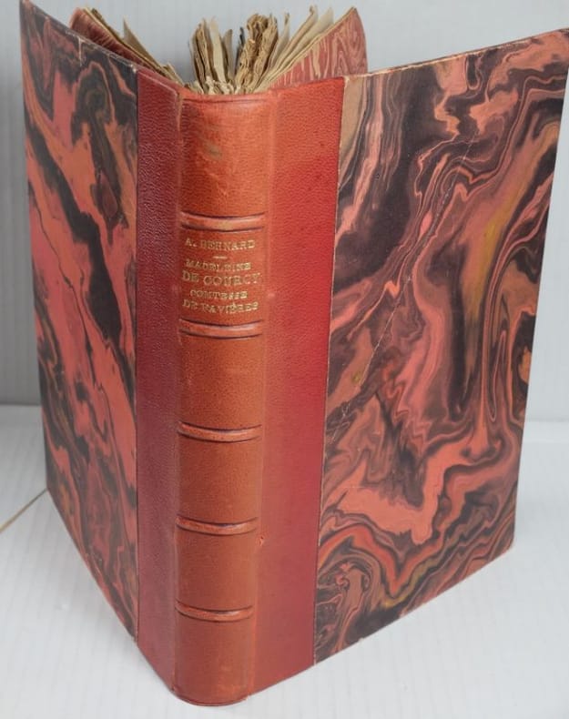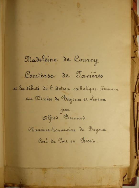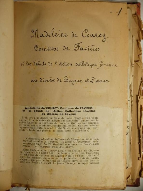 Madeleine Roussel de Courcy, comtesse de Favières, 1861-1928,fondatrice de l'Action Catholique Féminine dans le Diocèse de Bayeux et Lisieux,elle se dévoua corps et âme à sa mission; mariée à Guislain de Favières, 1855-1943,chargé du temporel, libérant ainsi son épouse qui se consacrée au spirituel.L'ouvrage présenté est une réunion de documents, dont, la biographie de l'intéressée par le curé de Port-en-Bessin, Alfred Bernard parue en livraisons dans la Semaine catholique de Bayeux et Lisieux, abondante correspondante, nombreuses coupures de presse : L'Action Catholique, La Croix du Calvados, compte-rendu des Congrès …
