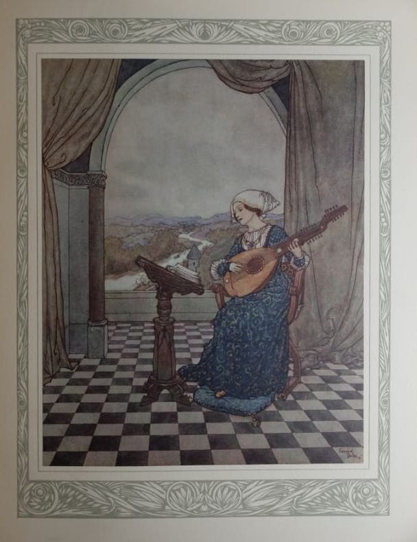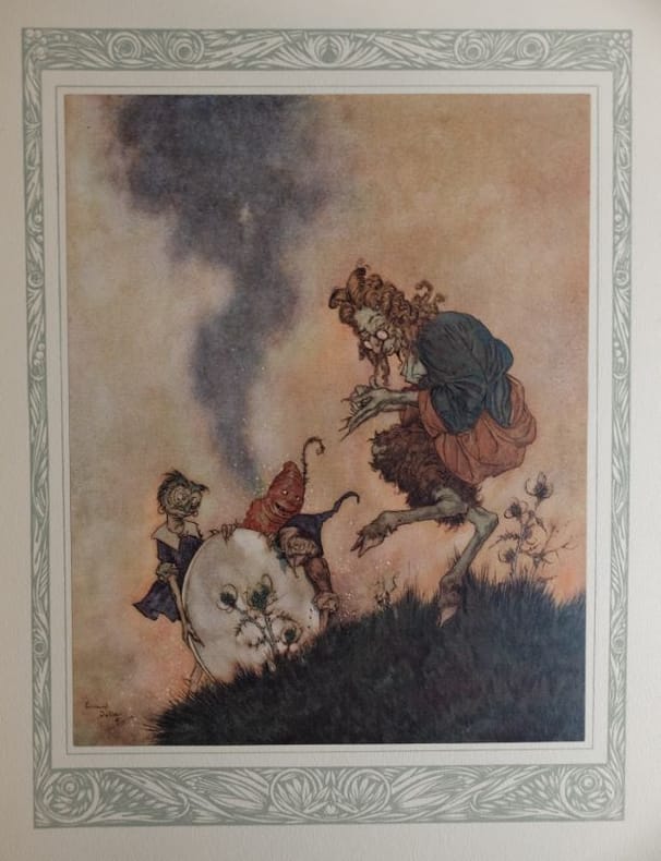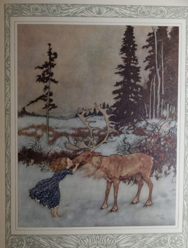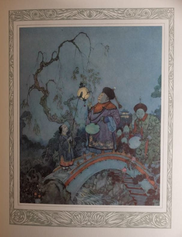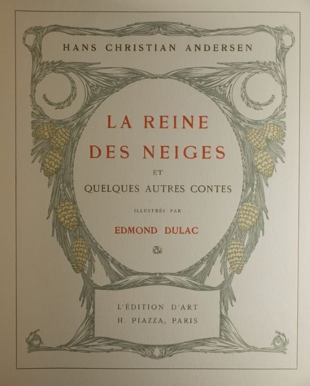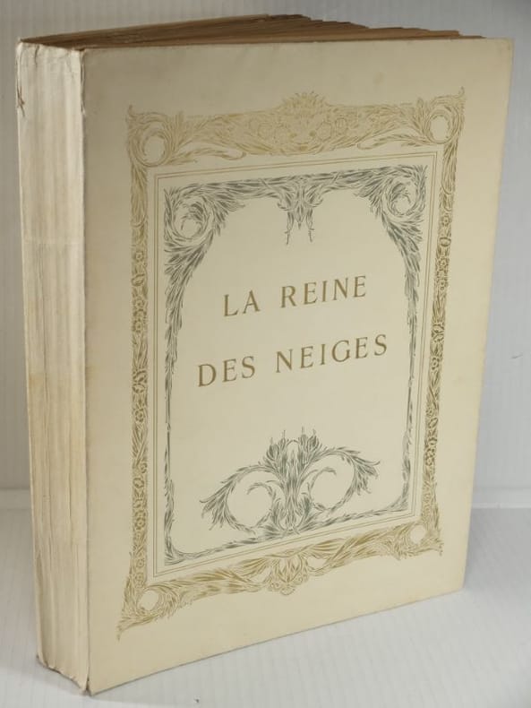 1911 La Reine des Neiges et quelques autres Contes, La petite Sirène, Le Rossignol, Une vraie Princesse, Conte du Vent, Les Habits neufs de l'Empereur, Le Jardin du Paradis, Paris, Edition d'Art Piazza, 1911,1 fort Volume broché, 303 x 234 mm. 171 pp.Couverture rempliée, dos lisse muet, Nom et date à la plume, en page de garde, 28 Illustrations couleurs sous serpente renseignées, de Edmond Dulac,petites fente au mors, en tête du dos, du reste, excellente condition.