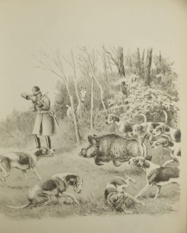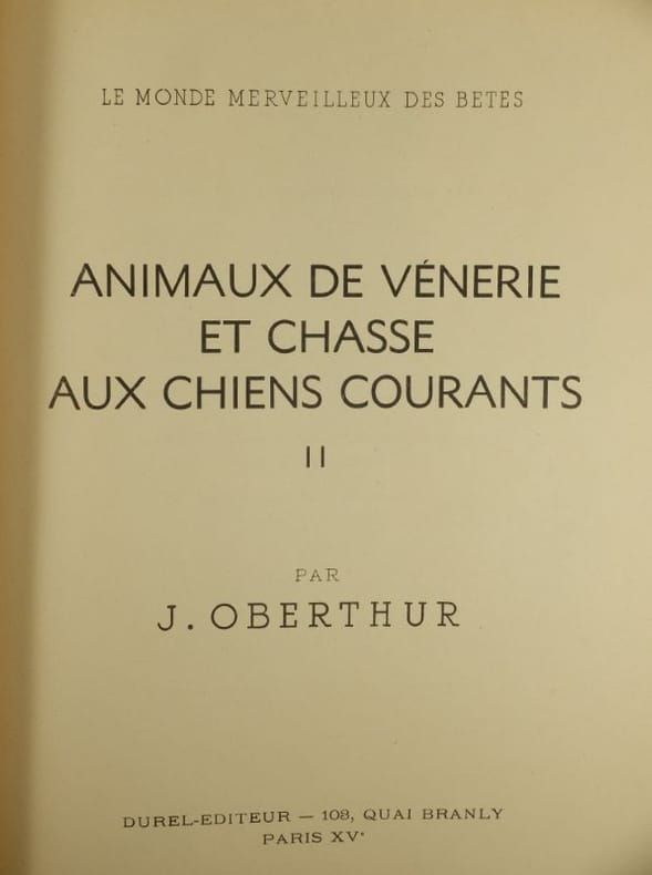 1947 Tome I, Histoire de la Vénerie, la Vénerie moderne, Us et Coutumes de la Vénerie, les Chiens de Vénerie et leurs spécialité, la Voie et ses éléments,le Cerf, le Daim, le Chevreuil, Tome II, le Sanglier, le Lièvre, le Renard, le Blaireau, la Loutre, le Loup,Paris, Rudel - Editeur, 1947, 2 Volumes brochés, 280 x 225 mm. 173-162 pp.Abondante Illustrations dans et hors texte,déchirure au mors du premier plat du tome I, du reste, bonne condition.