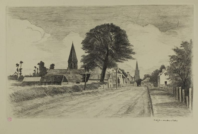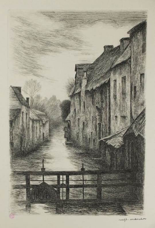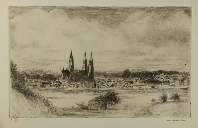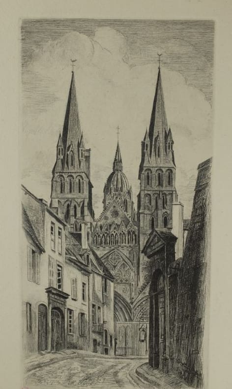 "On m'a baptisé "le sauveur de Bayeux" je suis bien incapable de dire si j'ai sauvé Bayeux,je sais seulement que le matin du 7 juin 1944, j'ai risqué ma peau pour pour avertir des Anglais débarqués la veille et arrêtés à 5 kilomètres de là qu'ils pouvaient entrer dans la ville que les Allemands avait quittée dans la nuit."Dom Aubourg, 1887-1967."Raphaël Manchon est né à Dozulé le 13 juin 1884. Elève à l'Ecole des Beaux-Arts de Caen,puis à Paris. Grand Pris de Rome. Mais c'est la Normandie qui demeure sa source d'inspiration : il publie notamment une vue cavalière de Caen en dix Planches. Après avoir été Conservateur du Musée Baron Gérard jusqu'en 1963.Il se retire à Maisons, près de Bayeux, où il s'éteint le 28 octobre 1975."in Basse-Normandie Terre d'Artistes, 1840-1940.