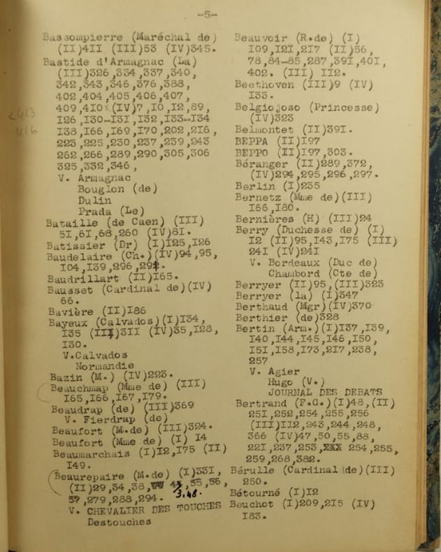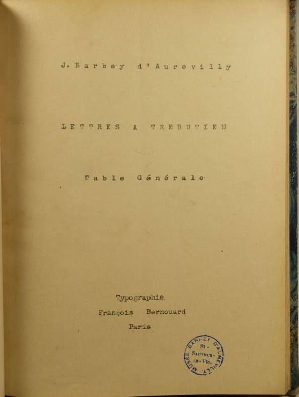 Table établie par un Amateur éclairé pour servir à l'Edition des Lettres à Trébutien de Jules Barbey d'Aurevilly en 4 Volumes parues chez François Bernouard Typographe à Paris,Tapuscrit, sous reliure demi cuir, dos lisse décoré, Titre en long, s.l. s.n. s.d. , 38 pp. 7 ff. bl. et 6 ff. bl. in fine, Le Tampon du Musée Barbey d'Aurevilly en page de faux titre, laisserait supposer que l'Auteur pourrait être le Président du Musée sise à Valognes.Corrections, en marge, au crayon papier ou à la plume.Ce travail universitaire est exemplaire et unique, l'Edition de Bernouard ne comporte pas d'index et autres notes.Bel exemplaire.
