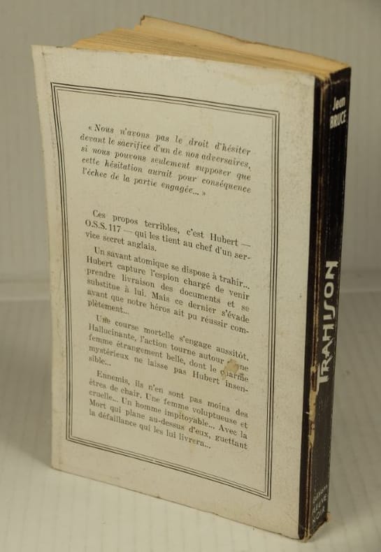 "Jean Alexandre Brochet, dit Jean Bruce, écrivain français, né le 22 mars 1921 à Paris et mort accidentellement le 26 mars 1963. Il est connu pour être l'auteur des aventures de l'agent secret Hubert Bonisseur de La Bath, alias « OSS 117 », narrées dans la série littéraire du même nom et dont de nombreuses aventures ont été adaptées au cinéma à partir des années 1960."Couverture signée Michel Gourdon, auteur de plus de 3500 Illustrations aux Editions Fleuve Noir. Il est le frère du non moins célèbre Aslan, dessinateur de Pin-ups dans le magazine "Lui".