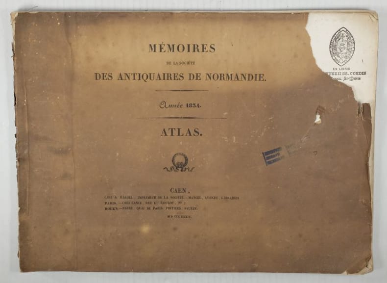 1834 Caen, Mancel, Brunet, Libraire, 1834, 2 Volumes brochés, 213 x 135 mm. 35, 550-555 pp. Pages non coupées, 1 Atlas broché, oblong, 255 x 348 mm.30 Planches, 16 pp.Tampon de Communauté en page de faux titre des 2 Volumes, Médaillon gratté en première de couverture des 2 Volumes, Tome II, petit manque de papier au second plat, rousseurs éparses.Atlas, nombreuses rousseurs, plus marquées au verso. Atlas, nombreuses rousseurs, plus marquées au verso, manque de papier au premier plat, dos avec manque,Tampon de Communautés, premier plat et page de garde.