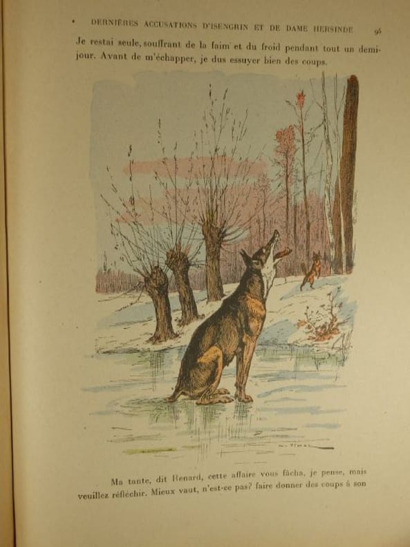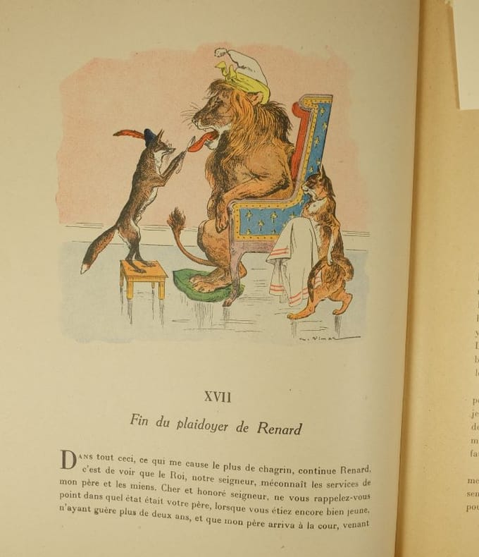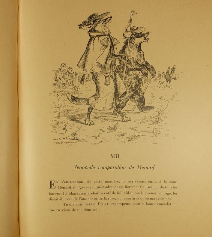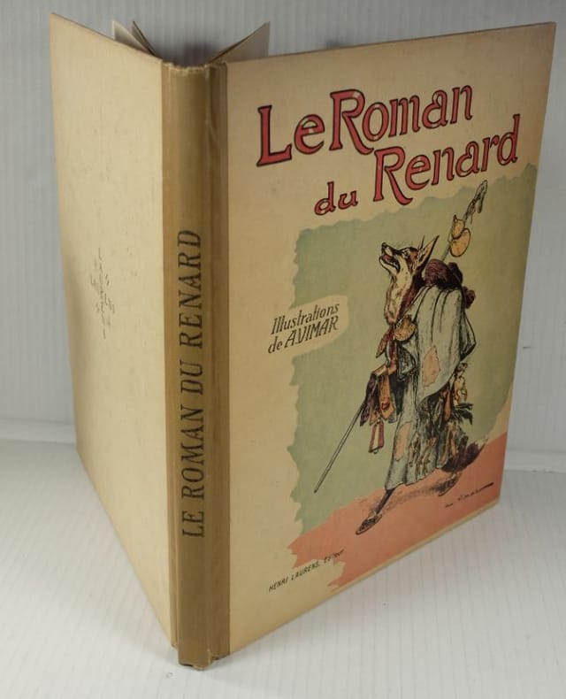 Composée entre 1170 et 1250, le Roman de Renard n'est pas l'oeuvre d'un seul auteur, mais une compilation d'histoires mêlant folklore populaire et création savante de clercs férus de culture latine (Pierre de Saint-Cloud, Richard de Lison). Le Roman de Renard met en scène une féodalité parodique d'animaux (Renard, Ysengrin le loup, Chantecler le coq, Brun l'ours, le corbeau Tiercelin, Noble le lion, Couart le lièvre, etc.) A la fois satire sociale et comédie de moeurs, on y trouve aussi l'inspiration des fables ésopiques gréco-latines. La légèreté drôle des scènes fut la raison de son succès, et de sa postérité. Bel exemplaire. Libraire membre du S.L.A.M. (Syndicat national de la Librairie Ancienne et Moderne) et de la L.I.L.A. (Ligue Internationale de la Librairie Ancienne). N'hésitez pas à prendre contact par mail pour des photographies et des détails supplémentaires, pour des recherches ou des estimations de livres anciens et rares.