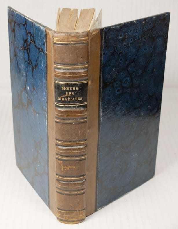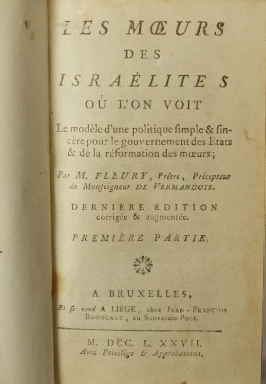 Les Mœurs des Israélites où l'on voit le Modèle d'une politique simple et sincère pour le Gouvernement des Etats et de la formation des Mœurs,Bruxelles, Jean-François Broncart, 1777, 2 Tomes en 1 Volume,1 Volume relié, 168 x 100 mm. 175,256 pp. Reliure demi cuir, dos à 4 nerfs, pièce de titre, maroquin noir,