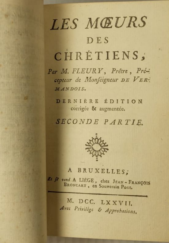 Les Mœurs des Israélites ou l'on voit le modele d'une politique simple & sincere pour le gouvernement des Etats & de la reforme des mœurs... Cinquième édition Corrigée & augmentée. Bruxelles, Frics, 1700 ; 4ff.n.ch- 205 pages. - L'agriculture en Terre Sainte ; les arts et métiers ; les habits ; la nourriture ; les plaisirs ; l'administration ; la guerre ; sectes et superstitions ; etc. [suivi, du même :] Les Mœurs des Chrétiens. Bruxelles et Liège, Jean Broncart, s.d. (privilège 1686) ; 4ff.n.ch.- 250 pages. Ces deux études sociales ont été souvent réimprimées ensemble aux XVIII° et jusqu'au XIX° siècle. Claude Fleury fut le précepteur des Ducs de Bourgogne, de Berry et d'Anjou, ainsi que le confesseur du jeune Louis XV. - Accrocs aux coiffes, coins légèrement choqués.