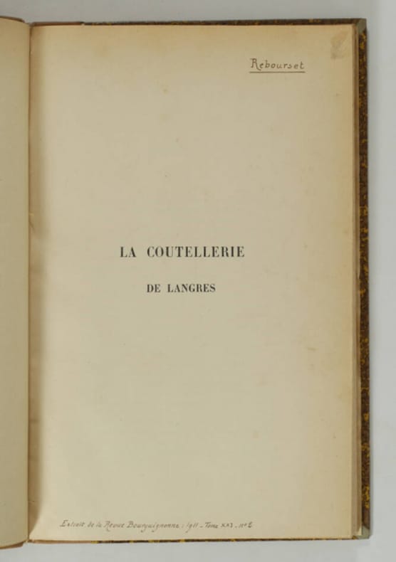 (S. l.), (s. n.), 1911. 340 g In-8, demi basane blonde, 85 pp., [1] f.. Extrait de la Revue Bourguignonne, 1911, t. XXI, n° 2. Peu courant, bien relié. . (Catégories : Haute-Marne, Coutellerie, )