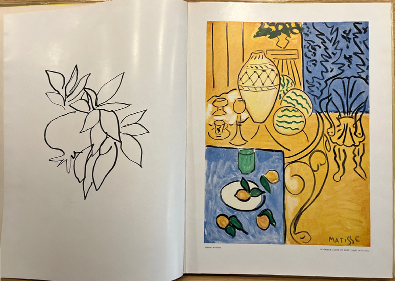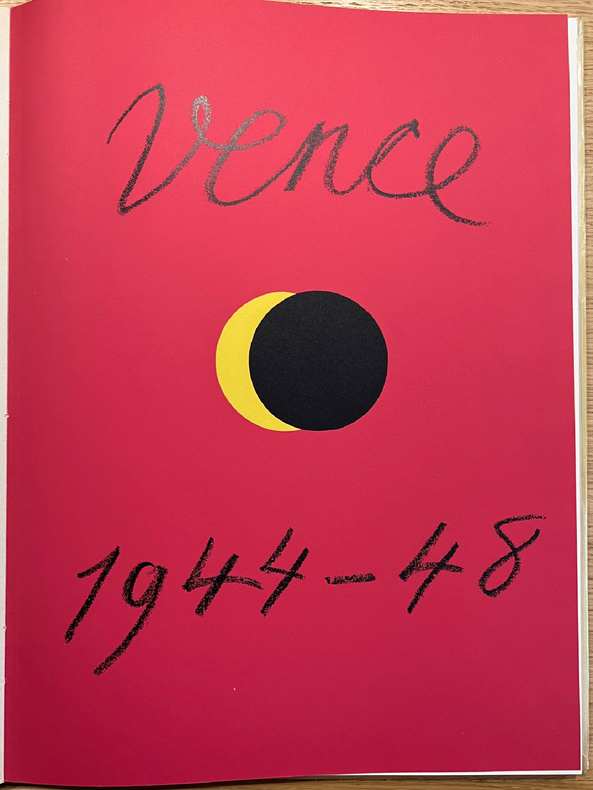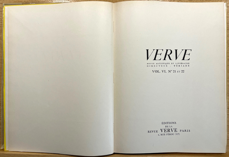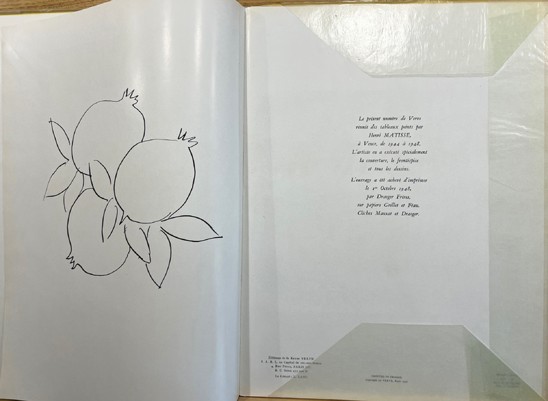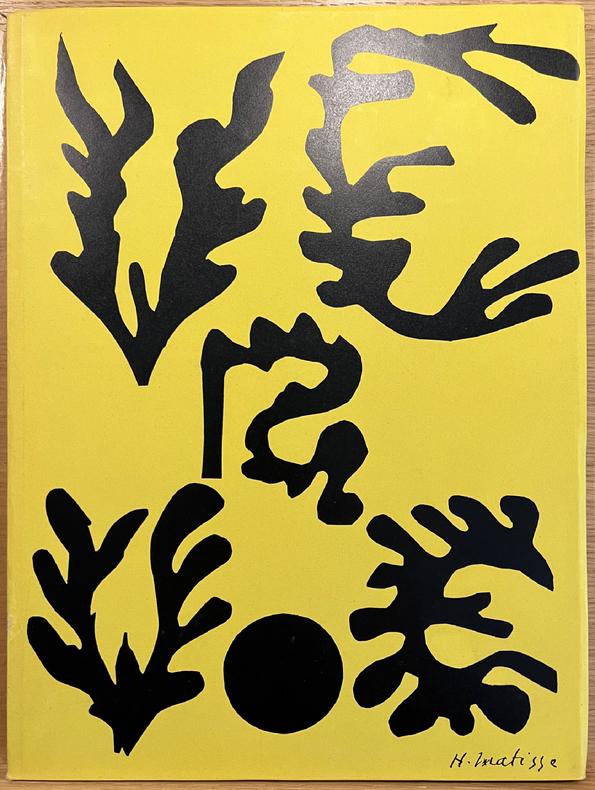 Éditions de la revue Verve, Paris 1948. Volume in-4 (355 x 260 mm), 76 pages, relié sous cartonnage éditeur, jaquette illustrée. - LA COUVERTURE, SPÉCIALEMENT CRÉÉE EN PAPIERS DÉCOUPÉS PAR HENRI MATISSE POUR CE NUMÉRO, EST REPRODUITE EN LITHOGRAPHIE. - 65 reproductions de peintures et dessins illustrent le volume. La couverture a été réalisée d'après une maquette en gouache découpée spécialement créée par Matisse en 1948. Cette composition est limité à deux couleurs jaune et noir, car pour l'artiste "le noir est une couleur"... L'artiste a également composé 40 ornements pour le texte. Avec un avant-propos de Matisse.