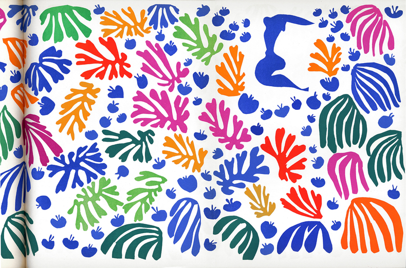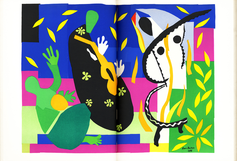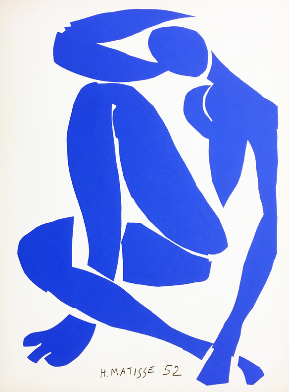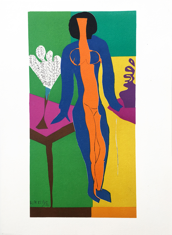 LITHOGRAPHIE EN COULEURS (36 x 52,8 cm) exécutée par Mourlot, d'après l'œuvre originale de 1952 en papiers découpés d'Henri Matisse, pour figurer dans Verve 35-36 (1958). BELLE ÉPREUVE SUR VÉLIN D'ARCHES À GRANDES MARGES, non pliée au centre. Tirage non mis dans le commerce, il était réservé à Tériade, à ses collaborateurs et amis. Parfait état.