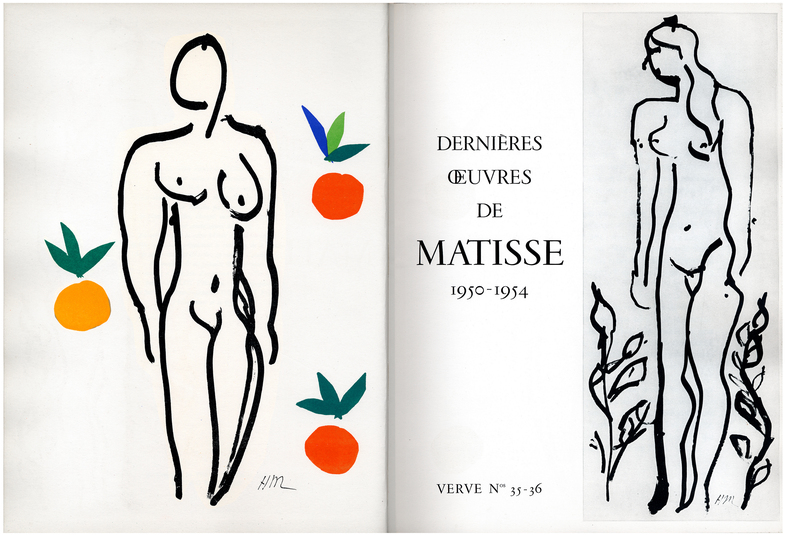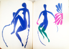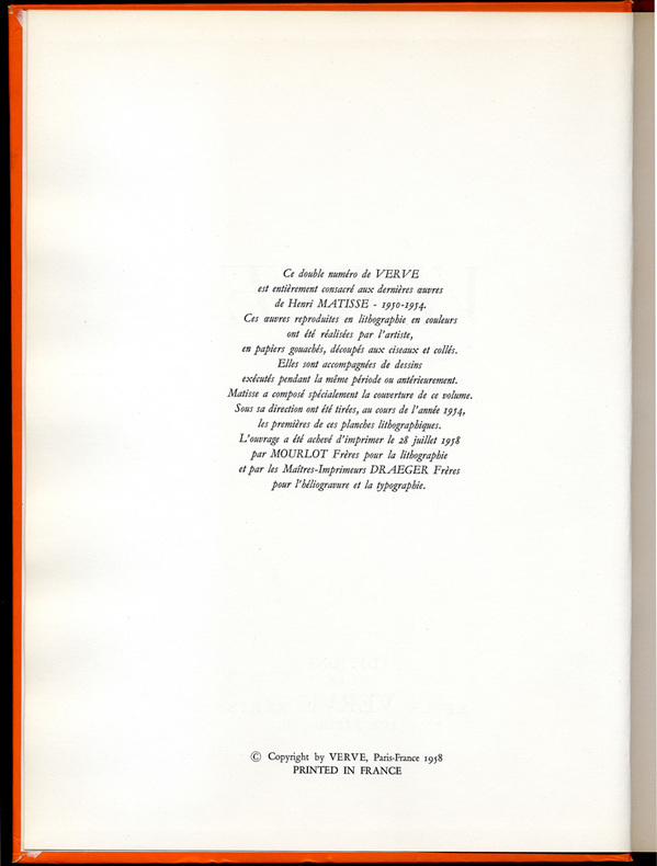 Éditions de la revue Verve, Paris 1958. Volume in-4 (365 x 270 mm), 184 pages, relié sous cartonnage éditeur. La couverture du cartonnage a été spécialement créée par Matisse. - 41 LITHOGRAPHIES EN COULEURS, certaines à double, triple ou quadruple feuillet dépliant. Estampes tirées par F. Mourlot d'après les papiers découpés de Henri Matisse. Nombreuses héliogravures à pleine page reproduisant des dessins de 1950 à 1954. Édition originale française. Superbe exemplaire du tirage original français. La couverture/cartonnage à l'état de neuf. L'intérieur est superbe, sans défauts. RARISSIME EXEMPLAIRE À L'ÉTAT NEUF ! PRIX SUR DEMANDE (Duthuit, Matisse les ouvrages illustrés, n°139 ; Paper cut-outs n°215) The book (365 x 270 mm) comprising 41 lithographs (including the frontispice) printed in colours, on wove, with title and text, the sheet edges, bound in orange paper covered-boards with lithograph designed by the artist, in beautiful condition, as new. A superb and perfect copy of the original french edition. AS NEW ! PRICE UPON REQUEST.