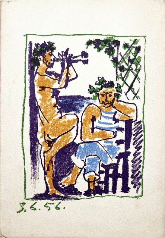Galerie 65, Cannes, 1956. Un volume in-12 (16,2 x 11,2 cm) de 40 pages environ, broché, couverture illustrée de la lithographie originale. Lithographie originale en quatre couleurs de Pablo Picasso. Elle a été spécialement dessinée pour l'illustration de couverture du catalogue de l'exposition "Picasso, Peintures Dessins Gravures rares à la Galerie 65, à Cannes, le 3 Juin 1956. Très beau sujet, typique des années méditerranéennes de l'artiste qui se représente ici en marin, portant sa fameuse "marinière"... Avec : le catalogue (16,2 x 11,2 cm) de 40 pages environ, illustré de nombreuses reproductions d'œuvres exposées et de photographies, en noir et blanc, de l'artiste entouré d'amis et de visiteurs de la galerie. Préface de Gilberte Duclaud, directrice de la Galerie 65. Impression par Mourlot Frères. —— ENGLISH DESCRIPTION : FAUNE ET MARIN. Méditerranée (1956). Original lithograph in four colors (12 x 8.5 cm), dated lower left: 3.6. (19) 56 (printed). Edited by Galerie 65, Cannes, on the occasion of the Picasso Exhibition in 1956. A beautiful subject, typical of the Mediterranean years of the artist who represents himself here as a sailor, wearing his famous "marinière"... Complete with the catalog (16.2 x 11.2 cm) of approximately 40 pages, illustrated with numerous reproductions of exhibited works and photographs, in black and white, of the artist surrounded by friends and visitors to the gallery. Preface by Gilberte Duclaud, director of Galerie 65. Printed by Mourlot Frères. —— An excellent proof with fresh colors, never framed or exposed to light. The complete work with the catalogue. Excellent condition of conservation. Références : Mourlot, (684) 284 - Bloch,800 - Rauch, 628 - Cramer Books, 75.