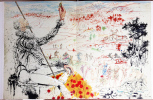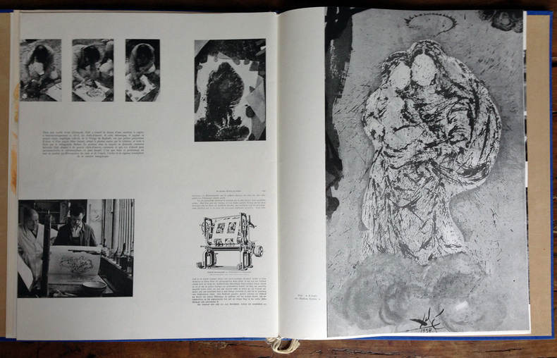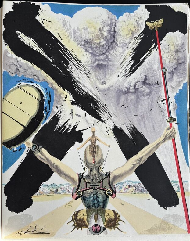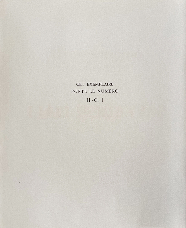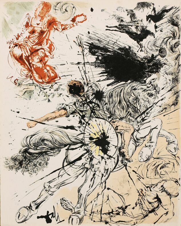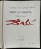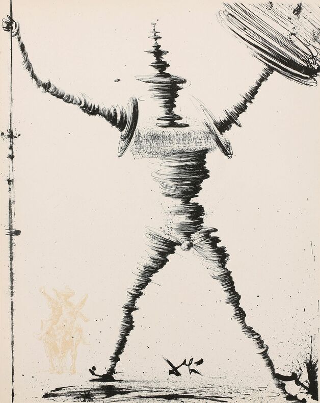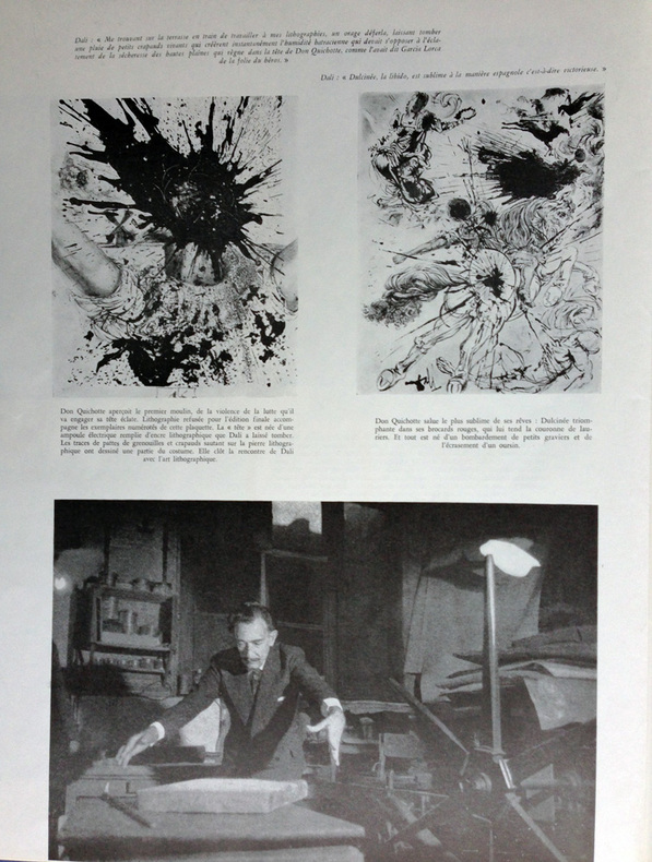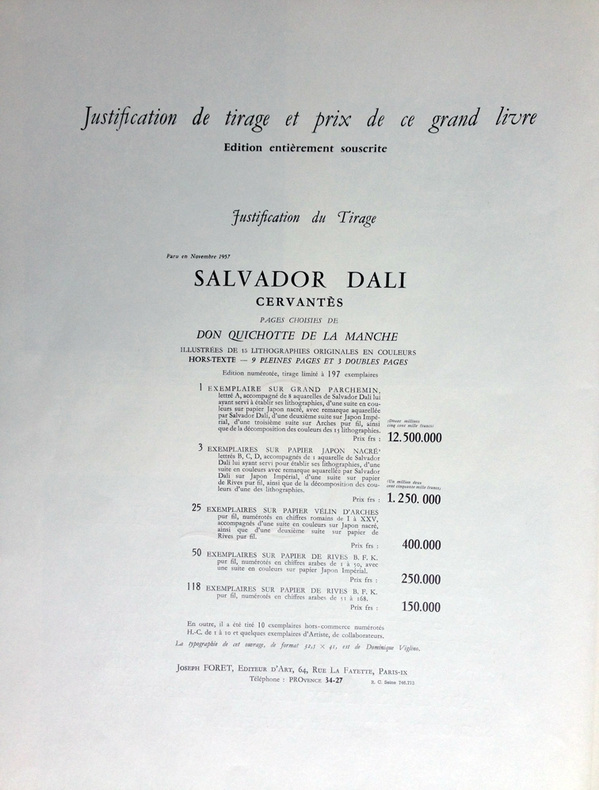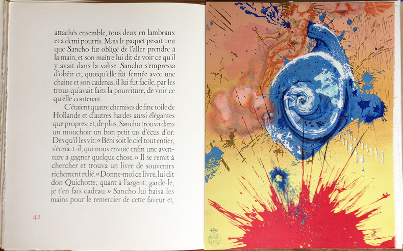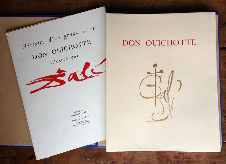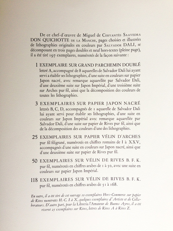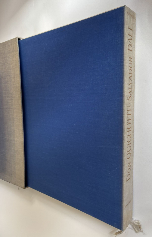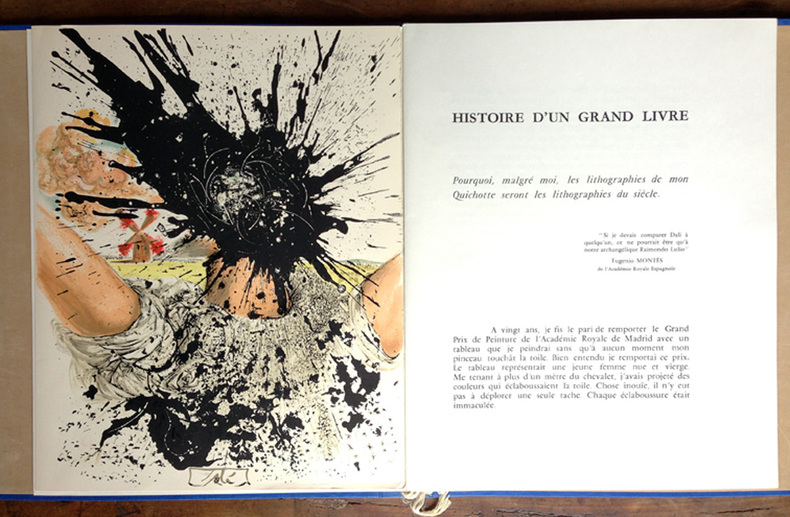 CERVANTÈS SAAVEDRA, Miguel de - DALI, Salvador : DON QUICHOTTE DE LA MANCHE. Joseph Foret, Paris 1957. Un volume in-folio en feuilles, couverture rempliée imprimée, chemise-étui de l'éditeur recouvert de soie bleue titrée or sur le dos. - 12 LITHOGRAPHIES ORIGINALES EN COULEURS DONT 3 À DOUBLE PAGE DE SALVADOR DALI. - LA RARISSIME 13ème LITHOGRAPHIE "DON QUICHOTTE À LA TÊTE QUI ÉCLATE". Tirage à 178 exemplaires, celui-ci l' 1 DES 10 HC sur vélin de Rives (le HC-I) accompagné de : - HISTOIRE D'UN GRAND LIVRE, textes de Michel Déon et Salvador Dali, comprenant la remarquable 13ème LITHOGRAPHIE également sur Rives. Le chef-d'œuvre lithographique de Salvador Dali. Exemplaire de choix comprenant 13 lithographies originales, DONC PARFAITEMENT COMPLET. L'ouvrage en parfait état, l'étui-chemise original de l'éditeur en excellent état, le dos et l'étui partiellement décoloré comme généralement. "Belle édition, c’est indéniable, les lithographies sont réellement de toute beauté, et singulière car cette illustration a été réalisée par l’artiste sur des pierres et du zinc lithographiques à l’aide non pas de pinceaux ou de crayons mais de balles d’arquebuse, d’escargots, d’insectes, de petits crapauds, de gravier, de boules d’argile, de mastic, de papier, d’œufs ou encore d’oursins. Certaines planches ne comportent pas moins de 20 couleurs alors qu’il n’en était prévu que 5 ou 6. Dali demanda également que l’on reporte sur pierre certaines projections et dessina ensuite les sujets principaux. « Ces sortes de « collages » lithographiques constitueraient à eux seuls, de l’avis même des artisans et maîtres lithographes qui ont prêté leur concours à l’accomplissement de ce livre, une réalisation sans précédent autant qu’inimitable". Références : Milcher-Löpsinger 1001-1012. _________________________________________________________________________________________________________________________________________________________________________________ CERVANTES SAAVEDRA, Miguel de - DALI, Salvador: DON QUIXOTE OF LA MANCHA. Joseph Foret, Paris 1957. A folio volume in sheets, printed folded cover, editor's slipcase covered with blue silk titled gold on the spine. - 12 ORIGINAL COLOR LITHOGRAPHS INCLUDING 3 DOUBLE PAGE BY SALVADOR DALI. - THE SCARCE 13th LITHOGRAPHY "DON QUIXOTE WITH THE EXPLODING HEAD". Edition of 178 copies, this one the 1 DES 10 HC on velin de Rives paper (The HC-I !) accompanied by: - HISTORY OF A BIG BOOK, texts by Michel Déon and Salvador Dali, including the remarkable 13th LITHOGRAPHY also on Rives. Salvador Dali's lithographic masterpiece. The complete book comprising 13 original lithographs, including the extra brochure with this supplementary plate. The book in perfect condition, the publisher's original slipcase in excellent condition, the spine discolored as usual. "Beautiful edition, it is undeniable, the lithographs are really beautiful, and singular because this illustration was produced by the artist on lithographic stones and zinc using not brushes or pencils but balls arquebuses, snails, insects, small toads, gravel, balls of clay, mastic, paper, eggs or even sea urchins. Some boards have no less than 20 colors so that only 5 or 6 were planned. Dali also asked that certain projections be transferred onto stone and then drew the main subjects. "These sorts of lithographic 'collages' would constitute in themselves, in the opinion even craftsmen and master lithographers who lent their support to the accomplishment of this book, an unprecedented and inimitable achievement". References: Milcher-Löpsinger 1001-1012.