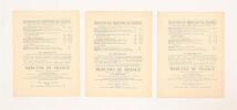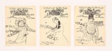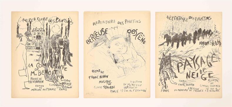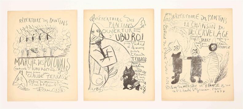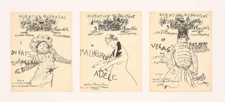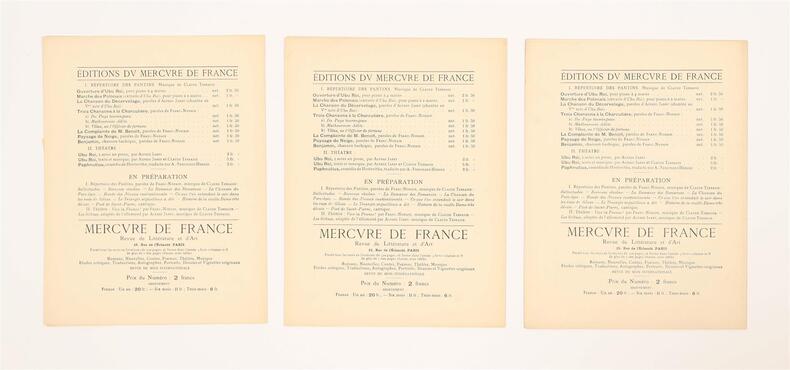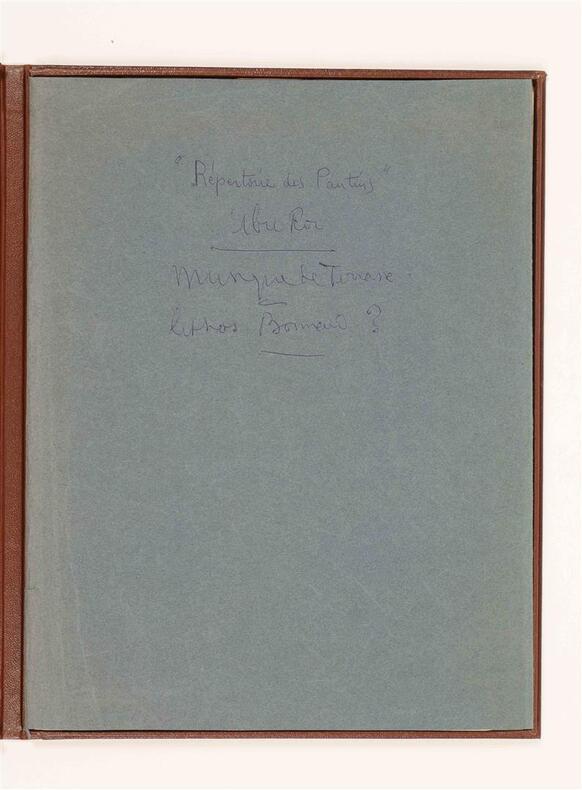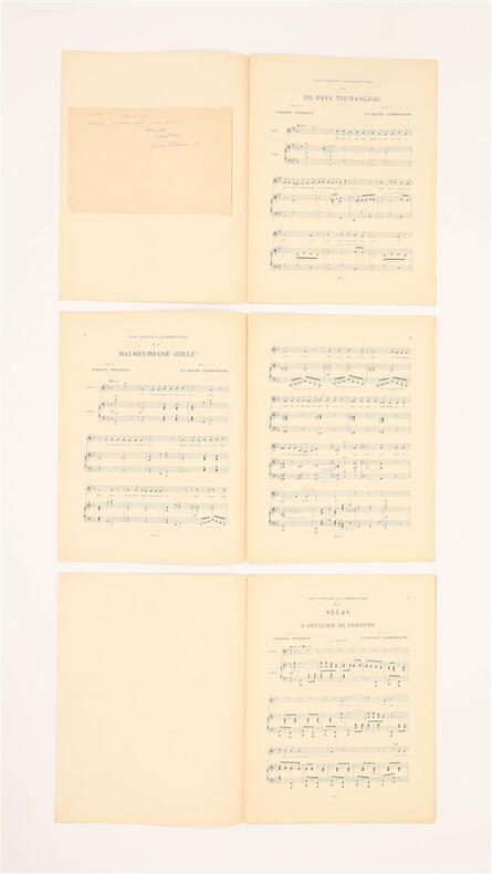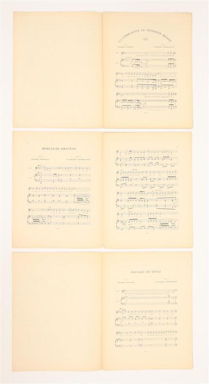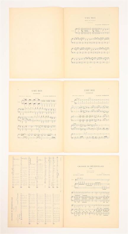 Paris, Mercure de France, 1896-1898. 9 fascicules in-folio (chaque environ 35 x 27 cm), brochés, couvertures illustrées, l'ensemble sous coffret moderne. Tirages originaux de ces mélodies composées par Claude Terrasse sur poèmes d'Alfred Jarry et de Franc-Nohain. La couverture de chaque partition est illustrée d'une lithographie originale en noir à pleine page : 6 de Pierre Bonnard pour les textes de Franc-Nohain: "Du Pays tourangeau, Malheureuse Adèle, Velas ou l'officier de fortune, La Complainte de M. Benoît, Paysage de neige, Berceuse obscène", et 3 d'Alfred Jarry pour ses propres textes : "Ouverture d'Ubu Roi, La Chanson du décervelage, Marche des Polonais". La collection est ici complète et en superbe état de conservation, soigneusement préservée dans un coffret commandité par le précédent amateur.
