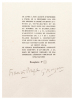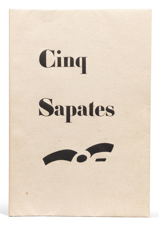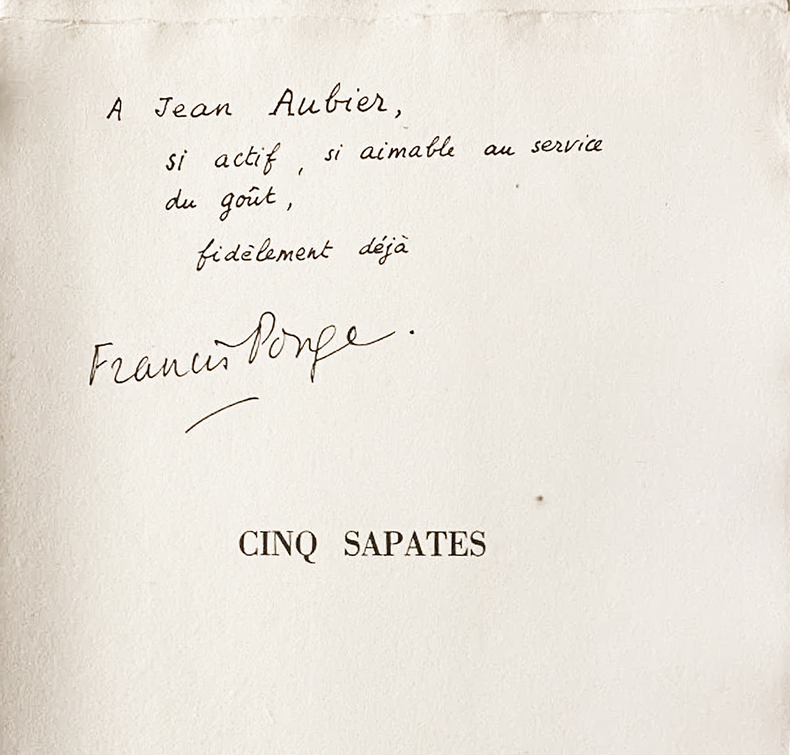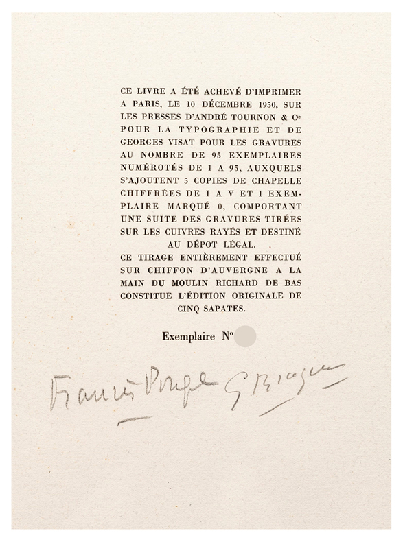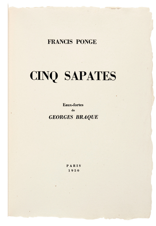 Paris, [Maeght éditeur], 1950. Un volume in-folio (408 x 283 mm), en feuilles, couverture imprimée rempliée, emboîtage de l'éditeur. Édition originale de 6 poèmes de Francis Ponge : "La Terre", "La Cruche", Les Olives", "Le Volet" et "Ébauche d'un poisson". Ces poèmes sont illustrés de cinq eaux-fortes et aquatintes originales de Braque, imprimées par Visat. Tirage limité à 101 exemplaires sur chiffon d'Auvergne à la main du Moulin Richard de Bas (n° 23). Tous signés par l'artiste et le poète. Nous proposons l'exemplaire de Georges Aubier portant une belle dédicace autographe de Ponge sur le faux-titre. L'ouvrage est dédié à René Char. -- ENGLISH DESCRIPTION: Francis Ponge, Cinq Sapates, Georges Braque, Paris, 1950. the complete set of five etchings and aquatints, on Auvergne laid paper, title, text and justification, the justification of the book is signed by the artist and author, copy number 23. Georges Aubier's copy bearing a beautiful autograph dedication by Ponge on the half-title page. The work is dedicated to René Char. The sheets generally in excellent condition, loose (as issued) within paper wrapper with title printed on front, within a cloth-covered portfolio (book. sheets: 408 x 283 mm).
