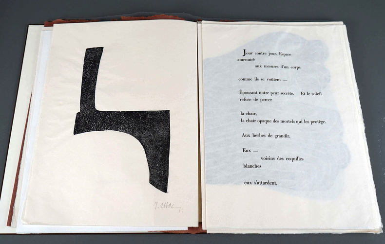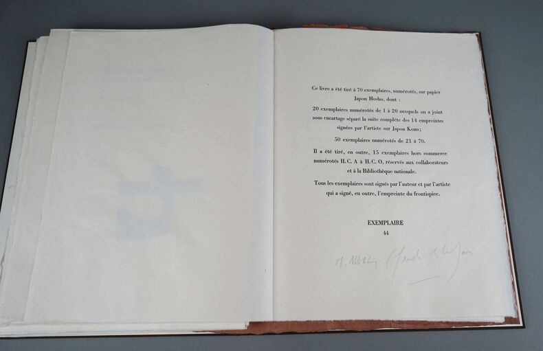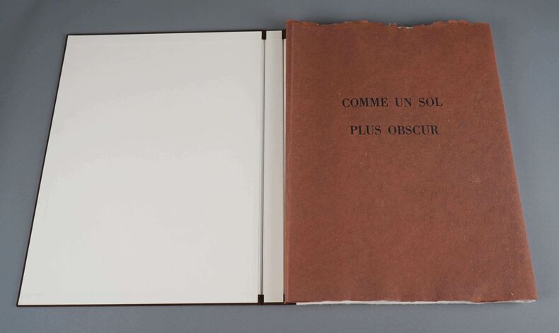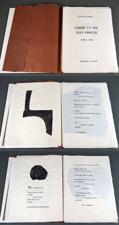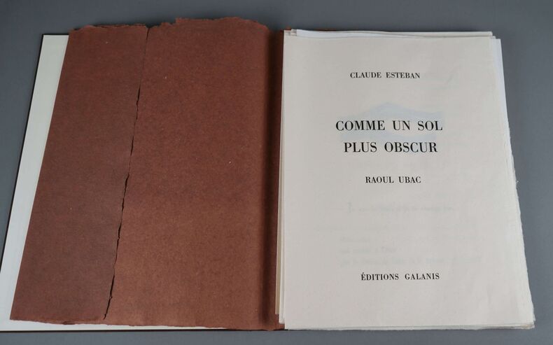 S.l. (Paris), Editions Galanis, s.d. (1980). In-folio (420 x 320), en feuilles, sur Japon Misumi, sous couverture d'Auvergne tabac imprimée du titre en noir sur le front, chemise et étui toilés de l'éditeur. Édition originale des poèmes de Claude Esteban 14 EMPREINTES ORIGINALES D'ARDOISES appliquées directement sur le papier dont 13 hors-texte, certains à double-page (420 x 640 mm) et 1 frontispice signé. Édition totale: 70 exemplaires + 15 HC), celui-ci un des 50 sur Japon Misumi (n°44) numéroté, signé par l'auteur et l'artiste.