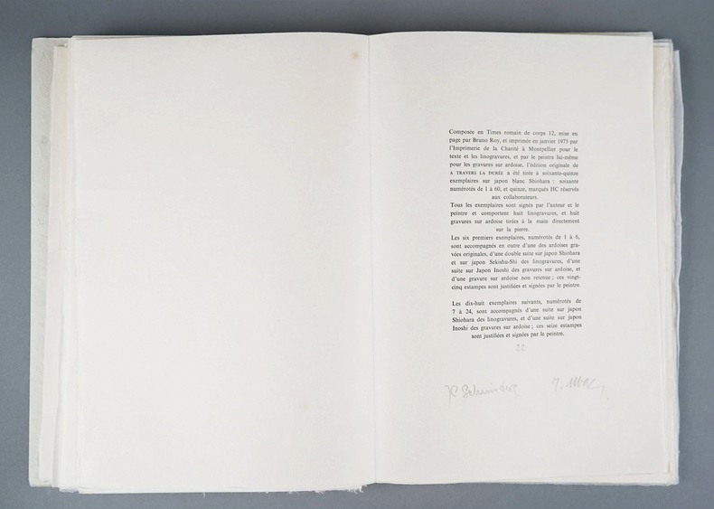 Éditions Fata Morgana, 1975. Un volume petit in-4 (27 x 18 cm) en feuilles, feuillets de texte et gravures sur Japon Shiohara, couverture imprimée, étui de l'éditeur. Édition originale ornée de 16 GRAVURES ORIGINALES DE RAOUL UBAC dont 8 gravures sur ardoises appliquées directement sur le papier Japon dont le frontispice signé et 8 linogravures, l'ensemble en hors-texte. Exemplaire de tête comportant UNE SUITE COMPLÈTE DES 16 GRAVURES TOUTES SIGNÉES ET JUSTIFIÉES 22/24AU CRAYON PAR L'ARTISTE. Tirage à 75 exemplaires numérotés sur papier Japon blanc Shiohara. - Exemplaire n° 22 signé par l'auteur et l'artiste faisant partie des 24 de tête comportant la suite des 8 linogravures sur Japon Shiohara et la suite des 8 gravures sur ardoise sur Japon Inoschi.