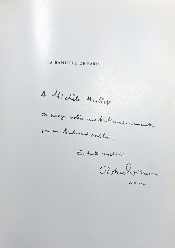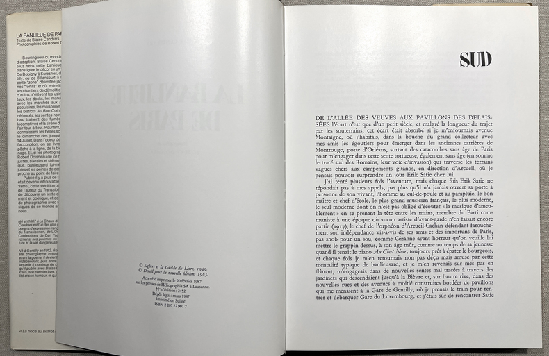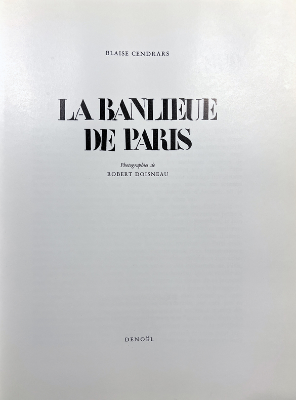 Paris, Denoël, 1983. Un volume in-4 (28,5 x 21,5 cm), 108 pages, reliure toilée noire de l'éditeur titrée au dos, jaquette originale illustrée. Troisième édition. 106 PHOTOGRAPHIES DE ROBERT DOISNEAU. Texte intégral de Blaise Cendrars (55 pages), table des illustrations (3 pages). Exemplaire enrichi d'un très bel envoi de Doisneau : "À Michèle Miallet ces images volées aux banlieusards inconscients, par un banlieusard roublard. En toute complicité, Robert Doisneau Juin 1992".